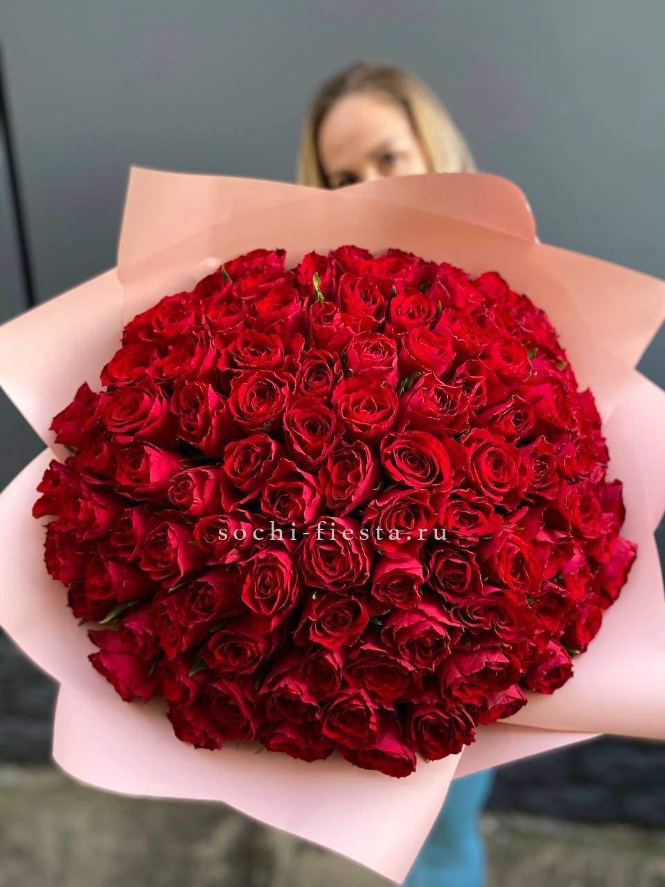 Сто одна роза Madam Red образует объёмное цветовое пятно с глубоким красным оттенком. Букет занимает пространство и сразу притягивает внимание своей насыщенностью.