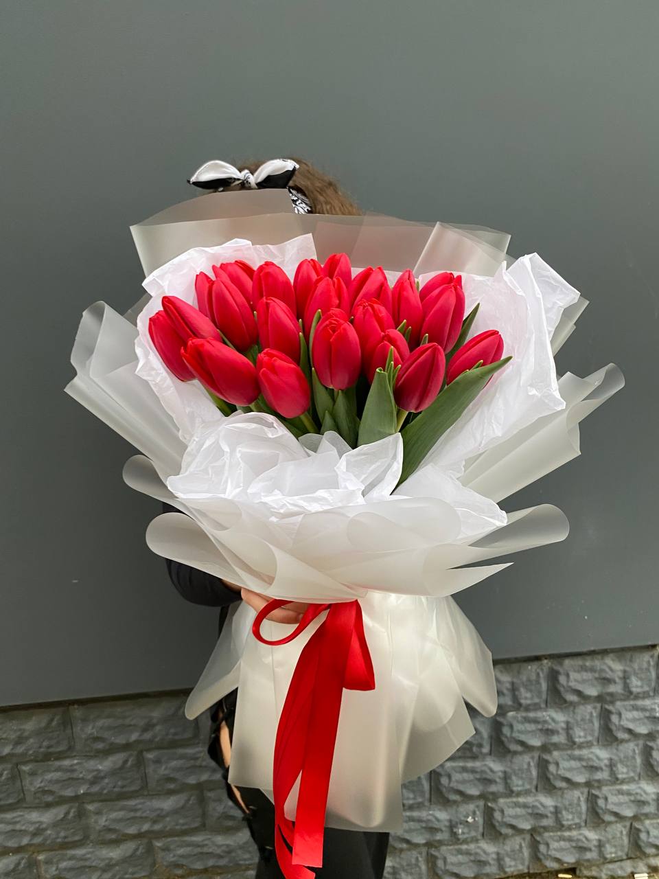 Двадцать пять алых тюльпанов выстроены в насыщенный монохромный букет. Красный цвет звучит уверенно и создаёт яркое впечатление с первого взгляда.