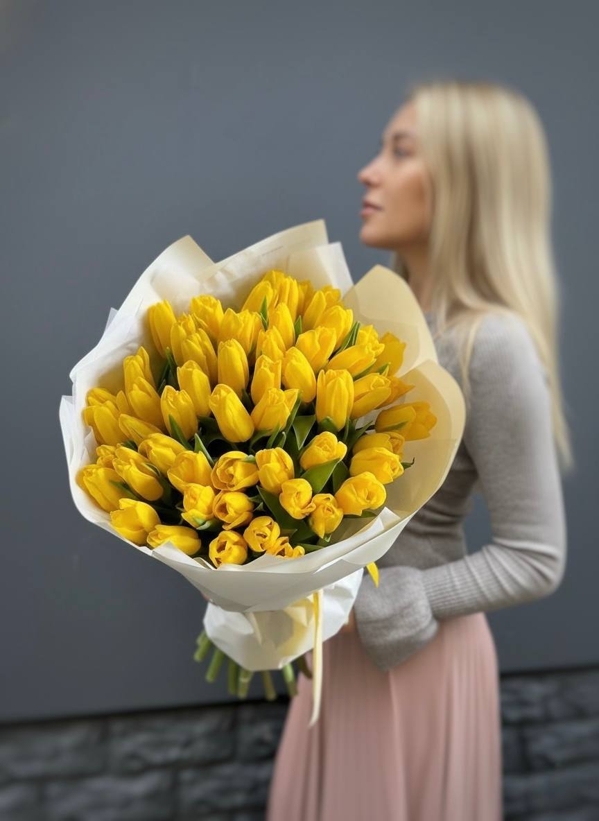 Пятьдесят один тюльпан собран в плотный монохромный букет, где каждый бутон держит форму и направление. Яркая весенняя палитра создаёт мощное визуальное присутствие в любом пространстве.