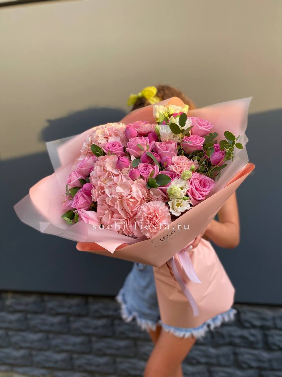 гортензия, мисти бабблс, роза, эустома, диантус, эвкалипт, авторская упаковка, лента