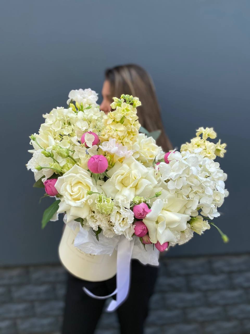 Многослойная композиция с герберами, эустомой и гортензией образует плавные переходы оттенков. Антиринум вытягивает силуэт вверх, придавая букету лёгкость и воздушность.
