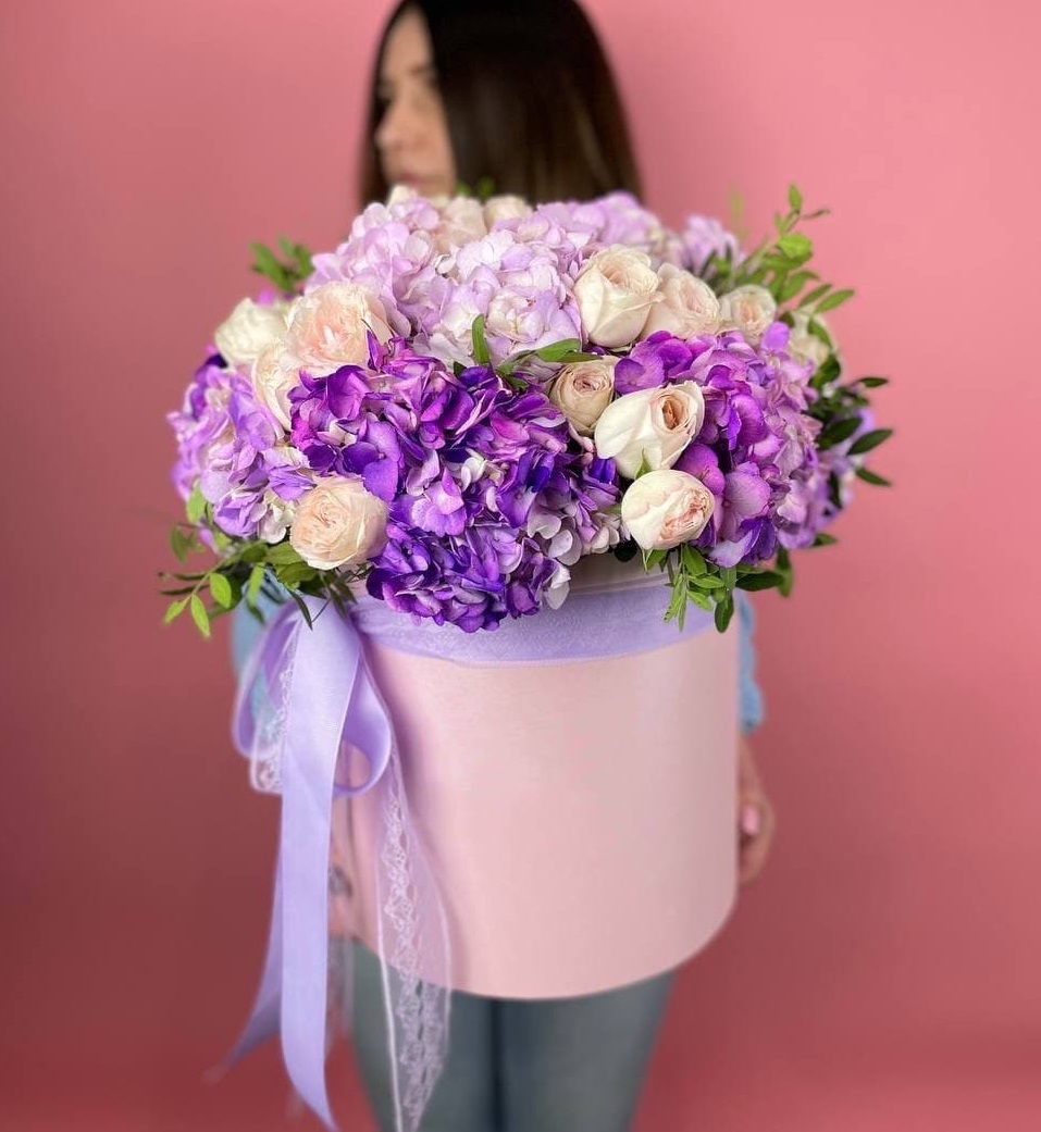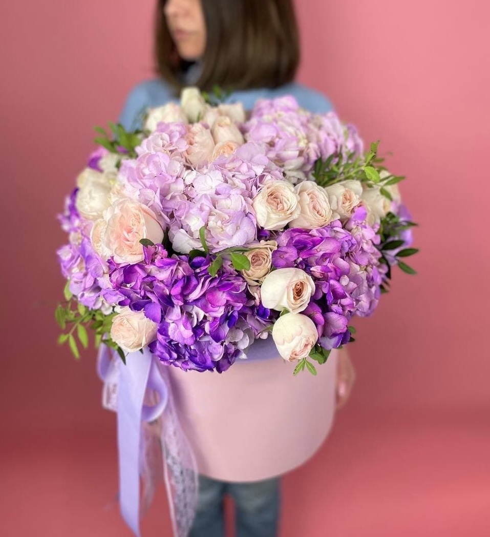 Крупные шапки гортензий формируют основу композиции, розы и эустомы заполняют пространство между ними. Диантусы добавляют графичности. Букет с впечатляющим присутствием и богатой палитрой.