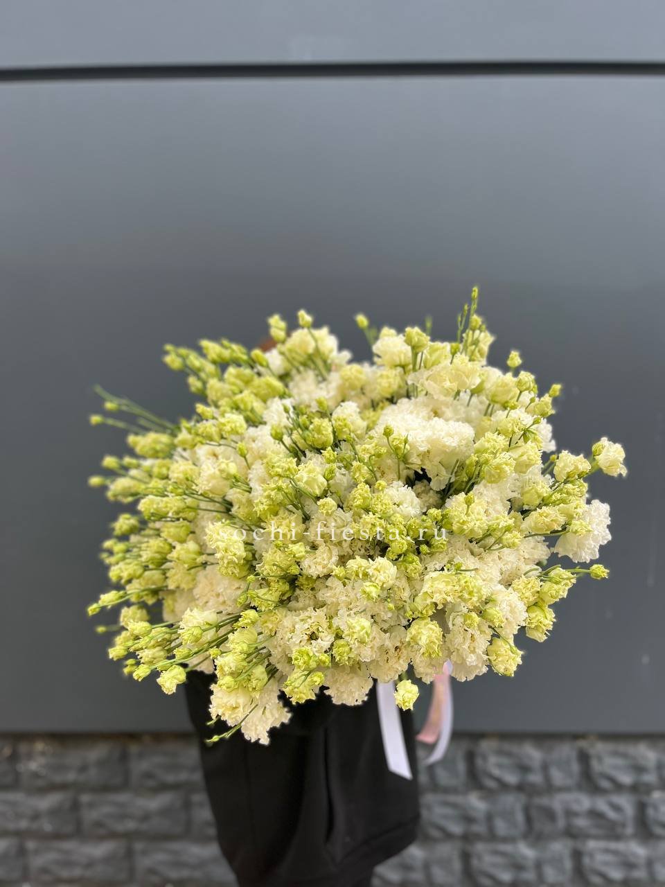 Монохромная композиция из белоснежных эустом в количестве пятидесяти одной штуки. Масштабная сборка впечатляет чистотой линий и графичным присутствием в пространстве.