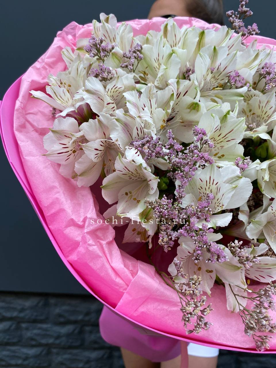 белые альстромерии - 11 шт., лимониум оформление.