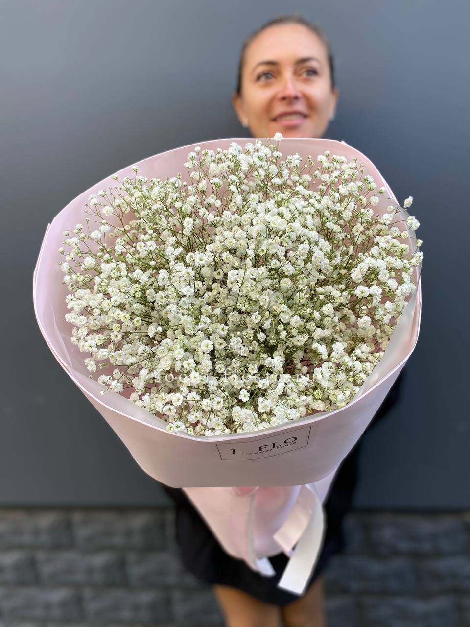Одиннадцать веток гипсофилы с мелкими соцветиями в комбинированной упаковке из фоамирана. Белые облачка цветов сохраняют форму и долго радуют глаз.