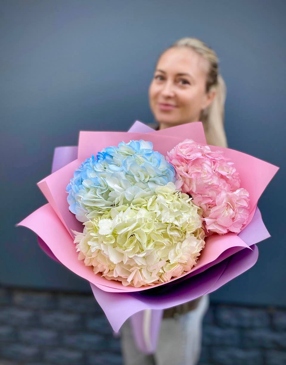 Пять соцветий гортензии в оригинальной упаковке-пиджачке. Необычная форма подачи превращает классический монобукет в яркий акцент для торжественного момента.