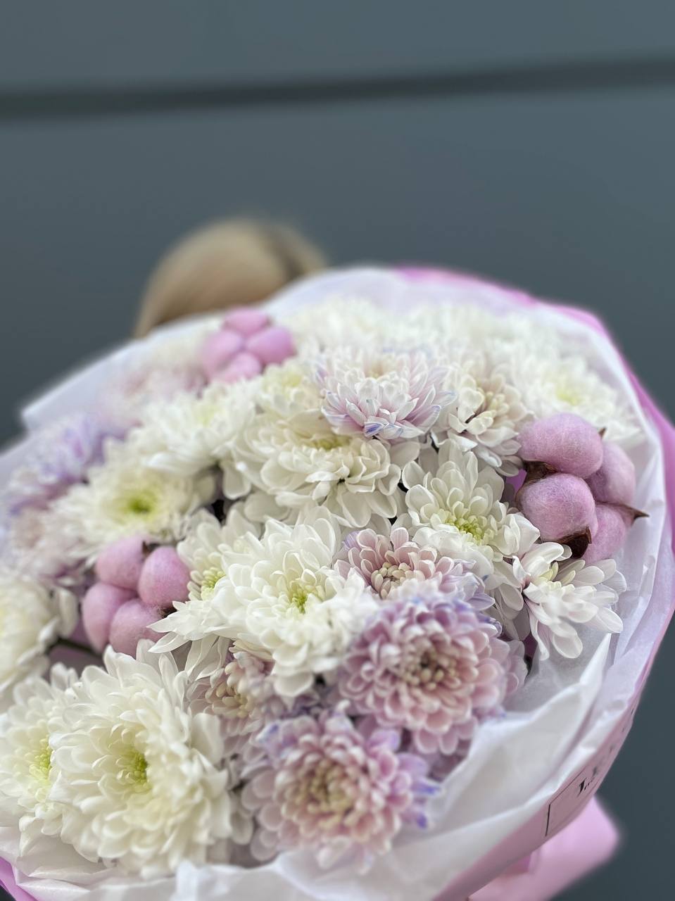Семь пышных хризантем с коробочками хлопка собраны в мягкую композицию пастельных оттенков. Воздушная сборка и естественные линии создают ощущение легкости. Букет для тихих встреч и теплых слов.