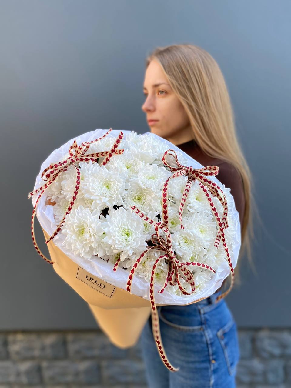 минимальный состав: 11 одноголовых хризантем, лента, упаковка на выбор.