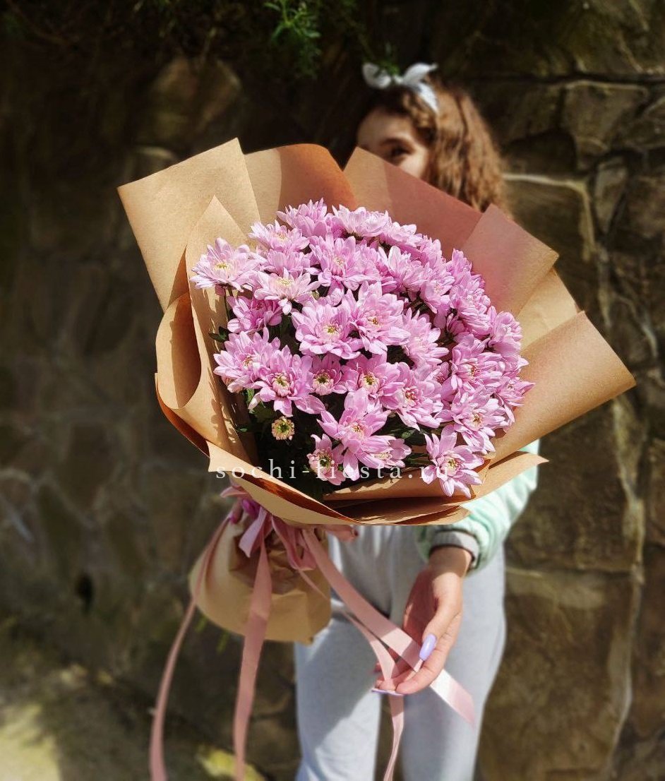Одиннадцать веток розовой кустовой хризантемы в натуральном крафте. Множество соцветий формируют пышный объем, а естественная подача сохраняет лёгкость и воздушность композиции.
