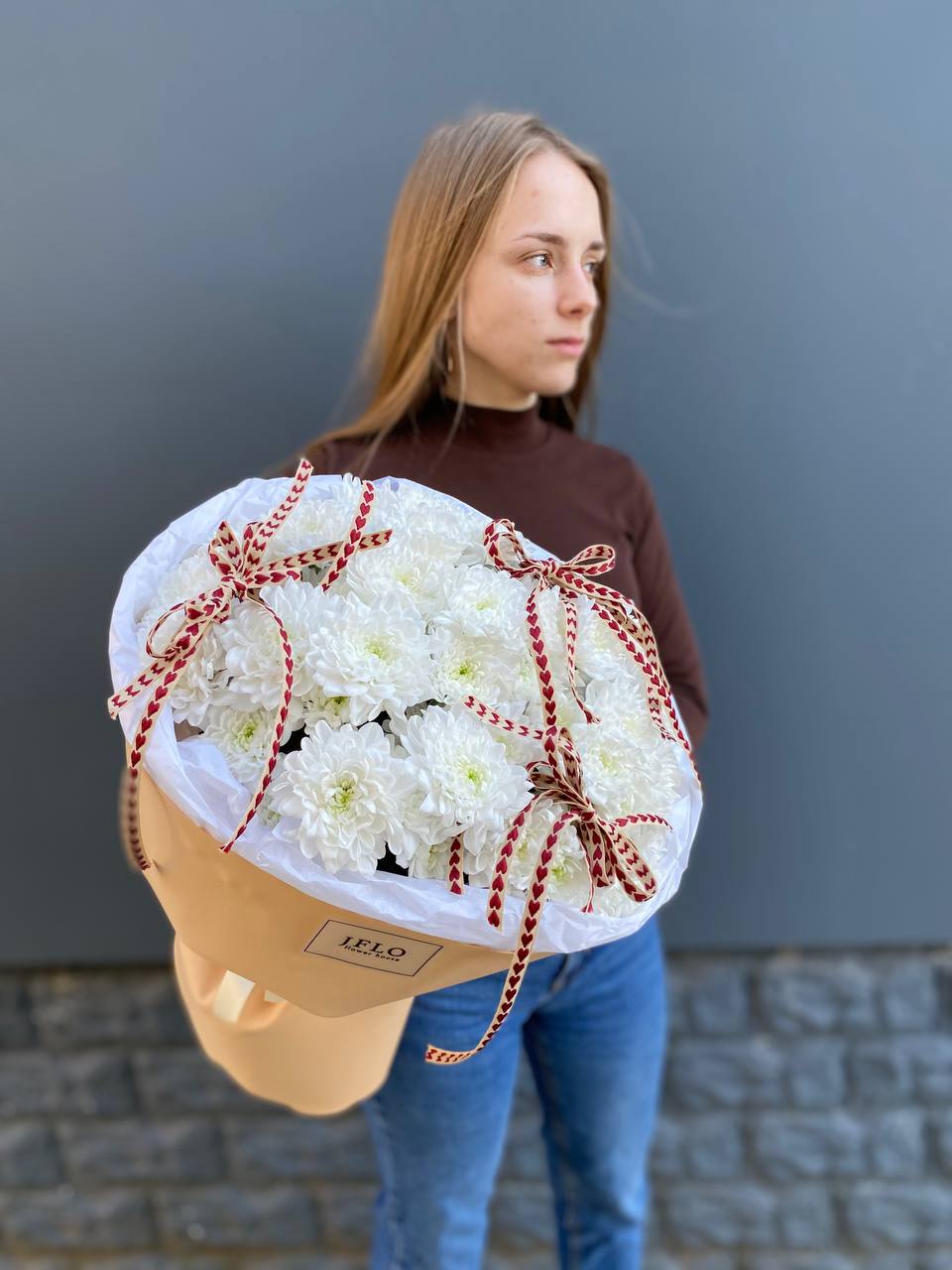 Семь хризантем собраны в плотную округлую форму и украшены бежевой упаковкой с тремя тонкими бантами. Сердечки на лентах добавляют композиции трогательности. Букет держит форму и выглядит аккуратно в руках или в вазе.