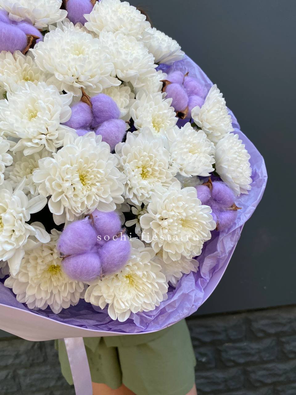 хризантема кустовая - 9 шт., лагурус, фоамиран, пленка,  лента.