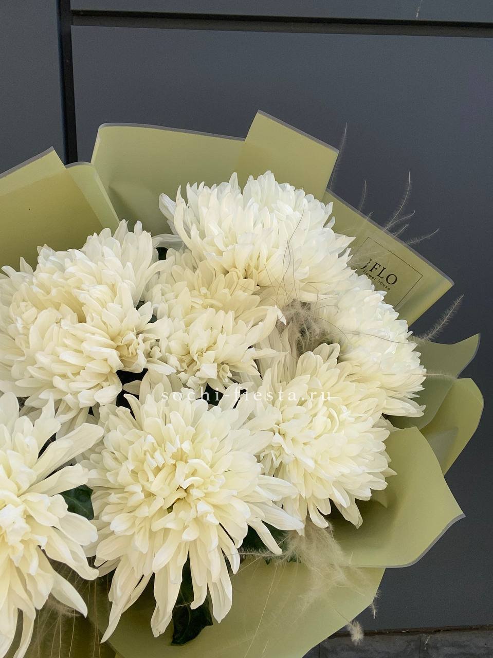 Крупные головки хризантем дополнены воздушными метёлками ковыля. Лаконичная упаковка сохраняет естественную красоту цветов и позволяет разместить букет в любом пространстве.