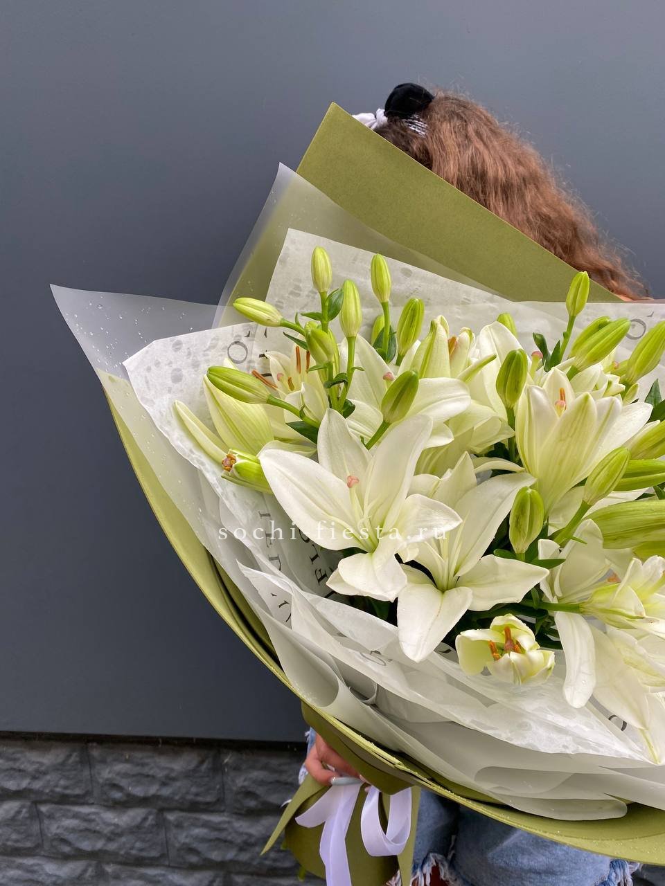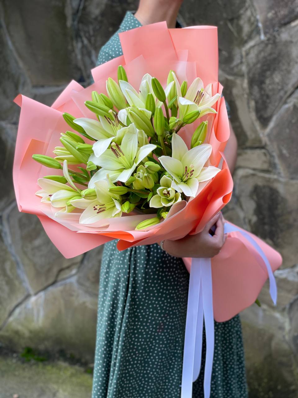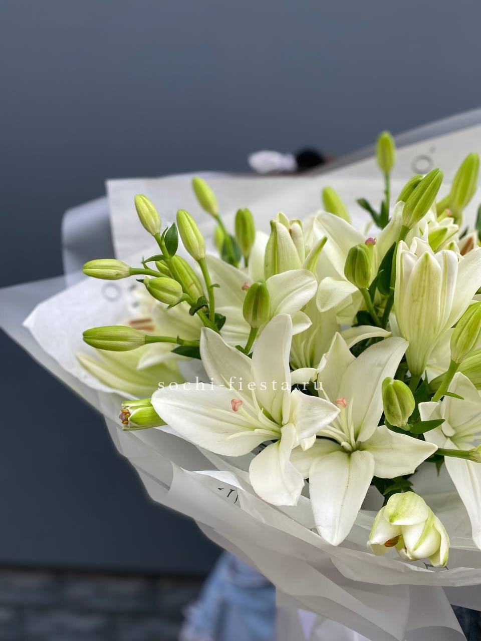 Семь белых лилий собраны в классический букет с лаконичной упаковкой. Крупные бутоны раскрываются постепенно, наполняя пространство своим присутствием.