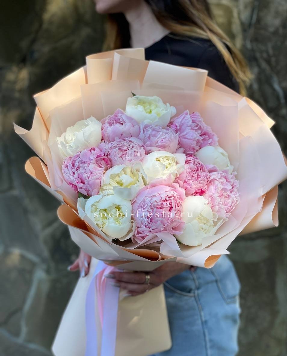 Пятнадцать пионов с пышными бутонами образуют объёмную композицию в воздушной упаковке. Каждый цветок раскрывается слоями, создавая ощущение лёгкости и наполненности одновременно.