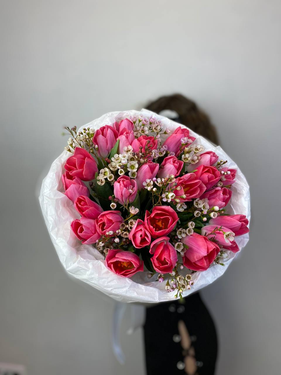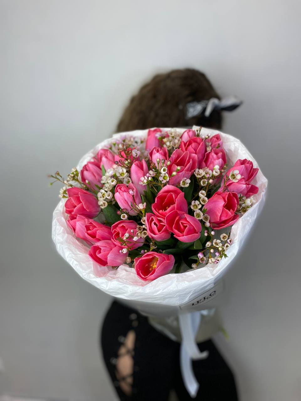 розовые тюльпаны, хамелациум, пленка.
