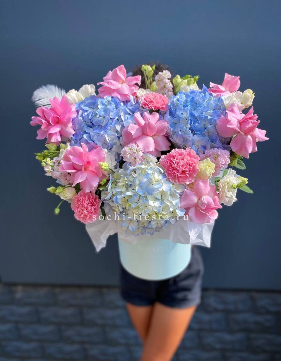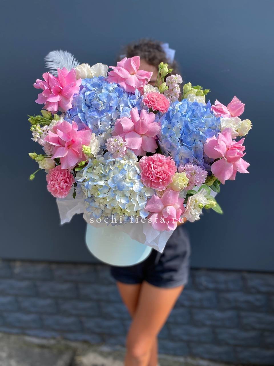 гортензии, пионы, пионовидная кустовая роза, маттиола, лента, дизайнерская упаковка.