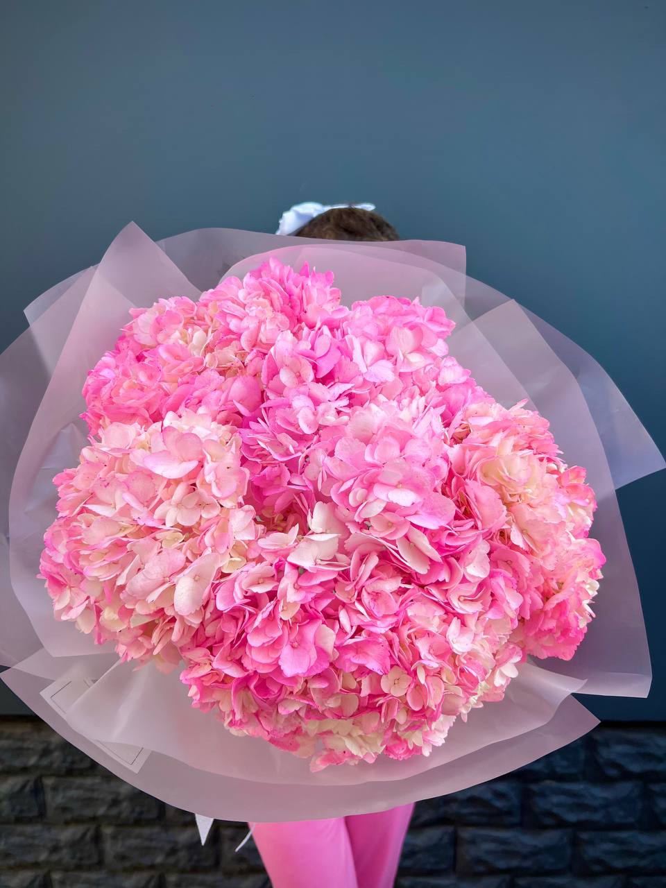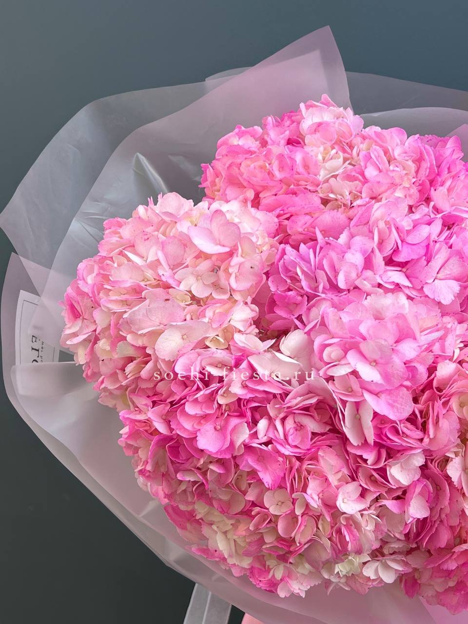 гортензия, протея, хамелациум, диантусы (или эустома), антуриум или лист стрелиции, дизайнерское оформление.