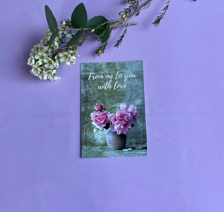 Чистый лист для ваших слов и почерка. Пространство открытки вмещает до семи предложений личного текста. Классическое решение для тех, кто хочет выразить чувства своими словами.