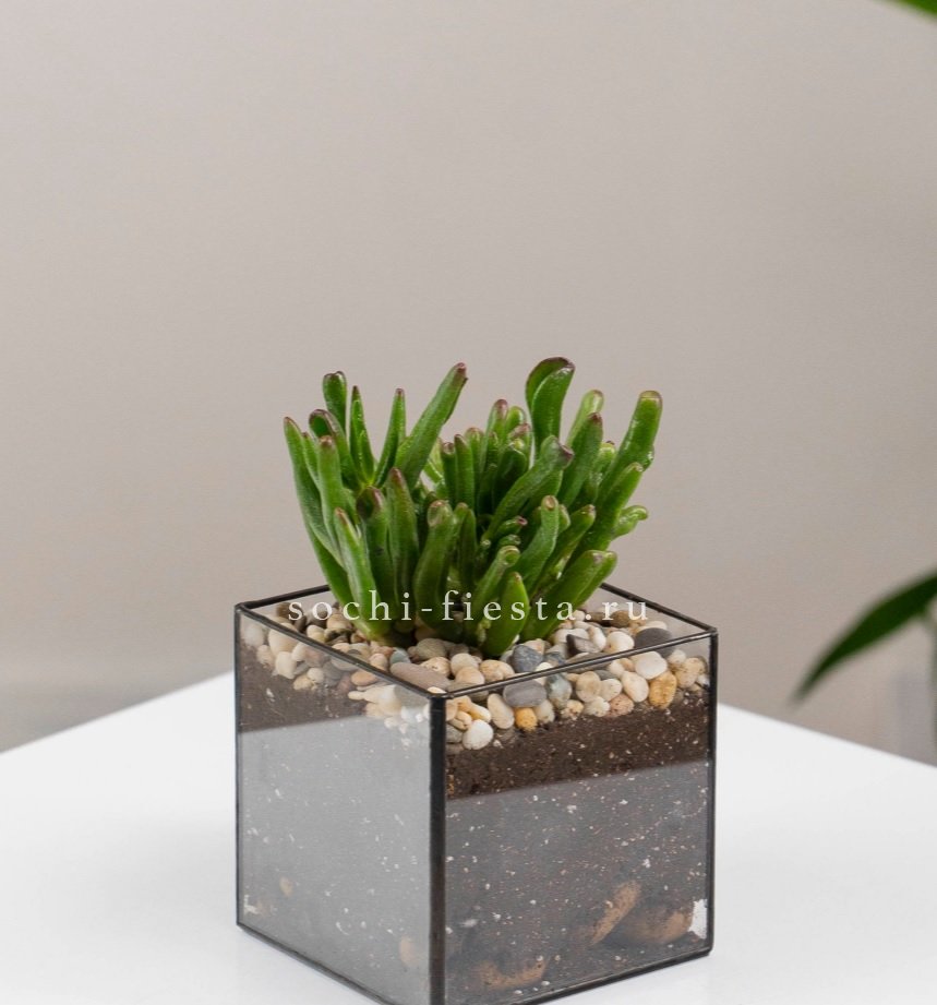 флорариум в кашпо Кубик идеален для подарка искушенным и практичным личностям. Растение неприхотливо в уходе, композиция стильно смотрится в любом пространстве:)
