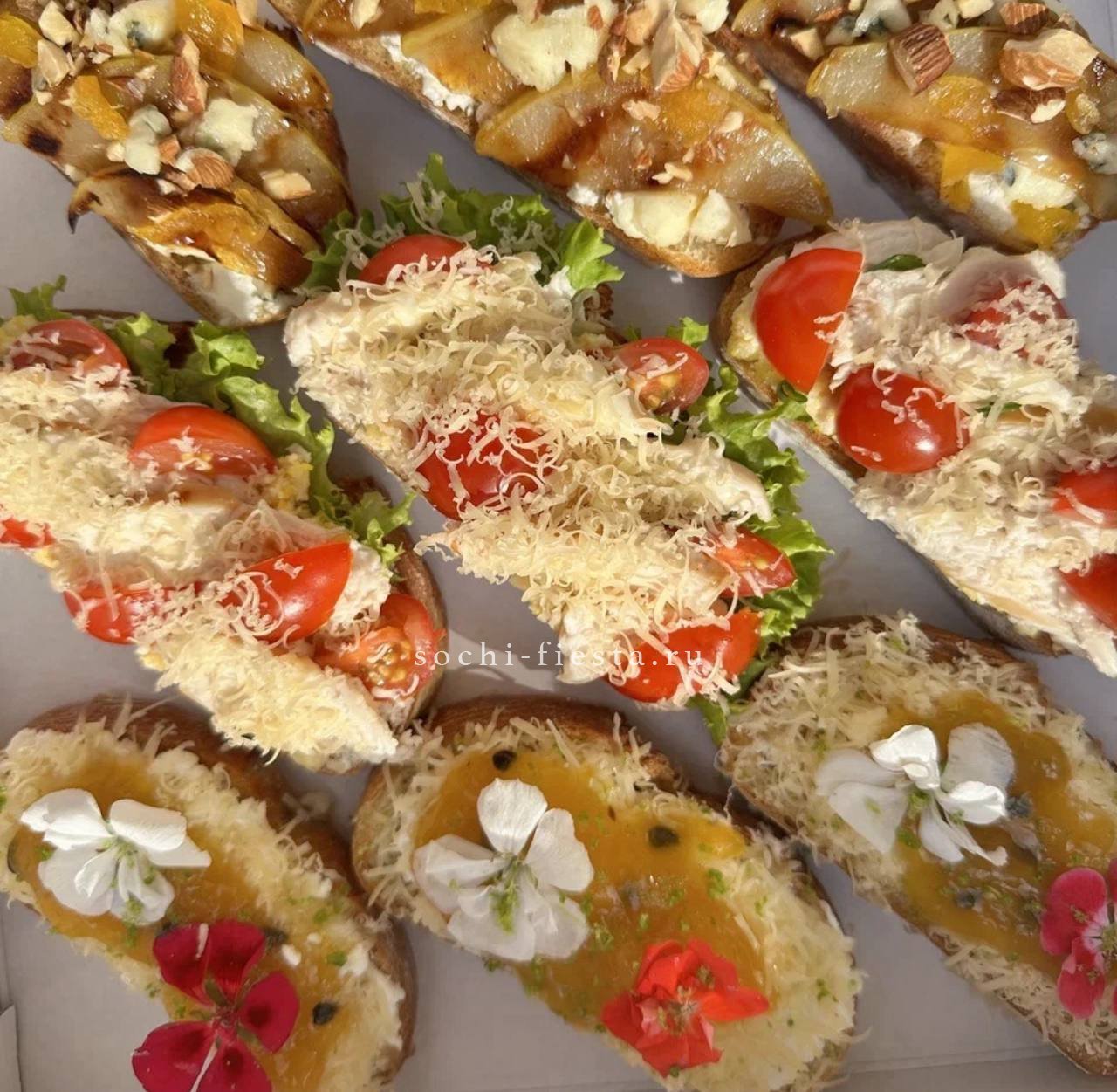 72 закуски. Ассорти мини-канапе закусочных — 32 шт. Картофель бейби в грудинке с корнишоном и черри- 10 шт. Салаты на шпажке: Греческий- 10шт. Цезарь с креветками— 10шт. Закуска к пиву хрустящая из слоеного теста с сыром и специями- 10шт.