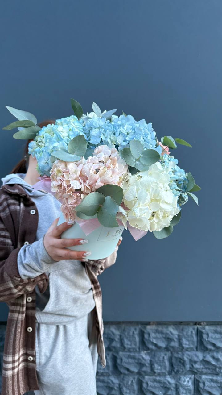 Лаконичная шляпная коробка — идеальный акцент, который подчеркивает пышность гортензий. Она станет стильным украшением любого интерьера, от классики до лофта. Тот случай, когда упаковка так же безупречна, как и само наполнение.