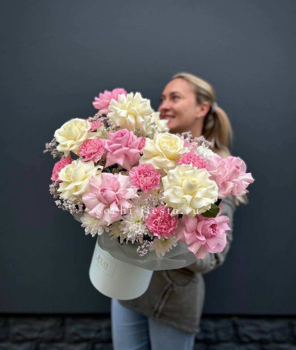 Для заказа товара "Коробка французских роз и диантусов "Бони"" с доставкой в Астрахани нажмите в корзину