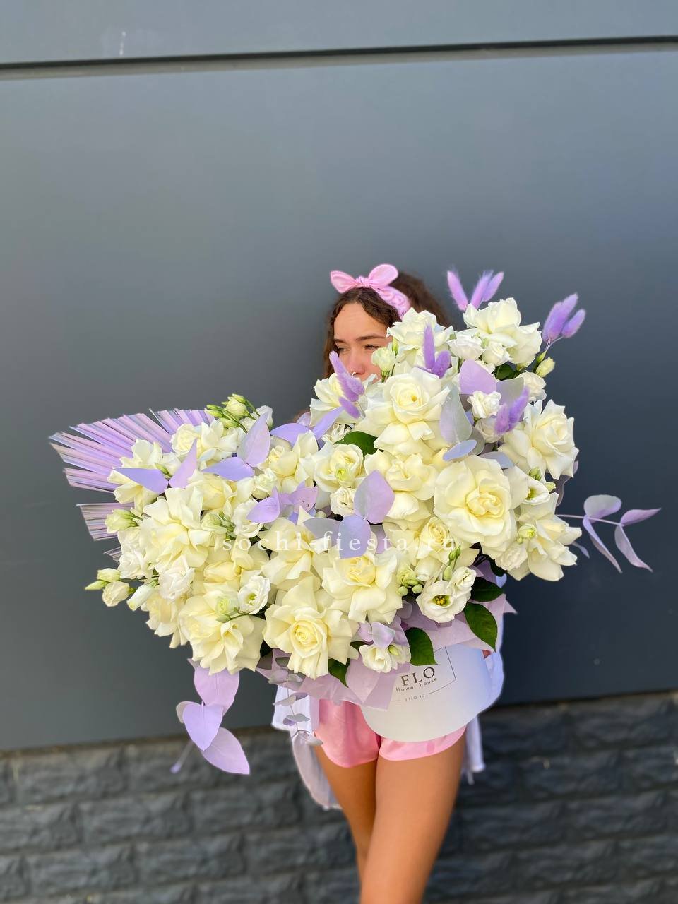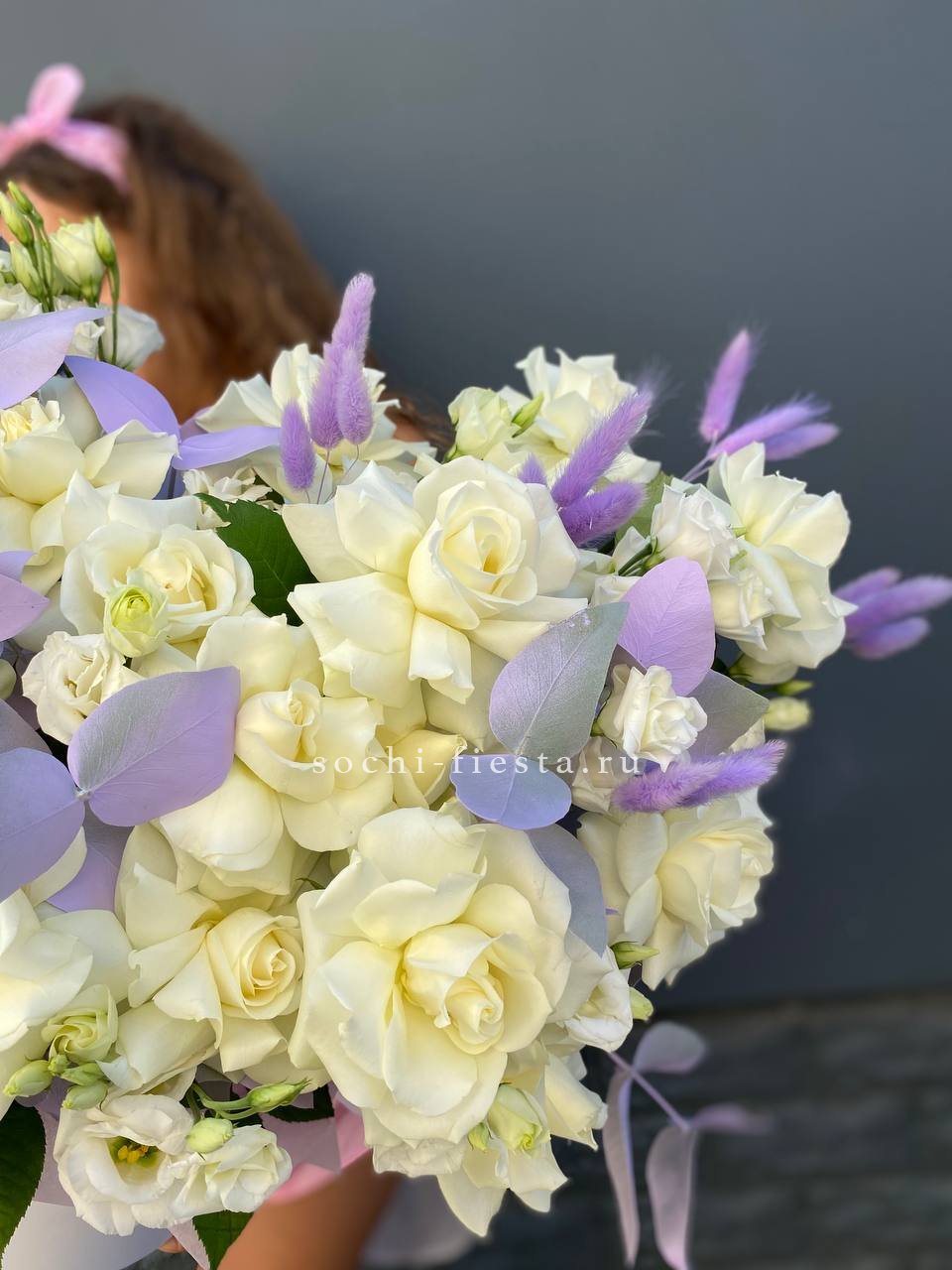 Белые французские розы раскрываются крупными бутонами и соседствуют с воздушной эустомой. Композиция создает ощущение легкости и света.