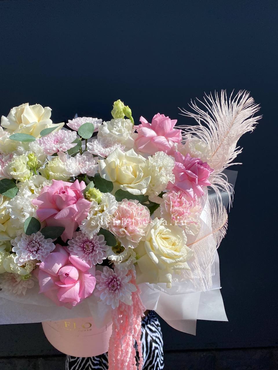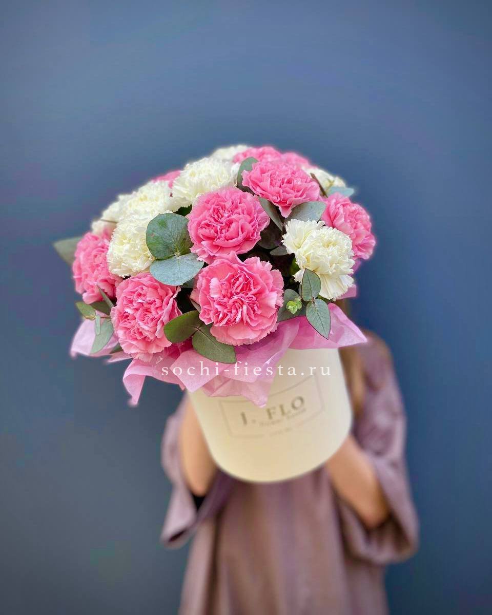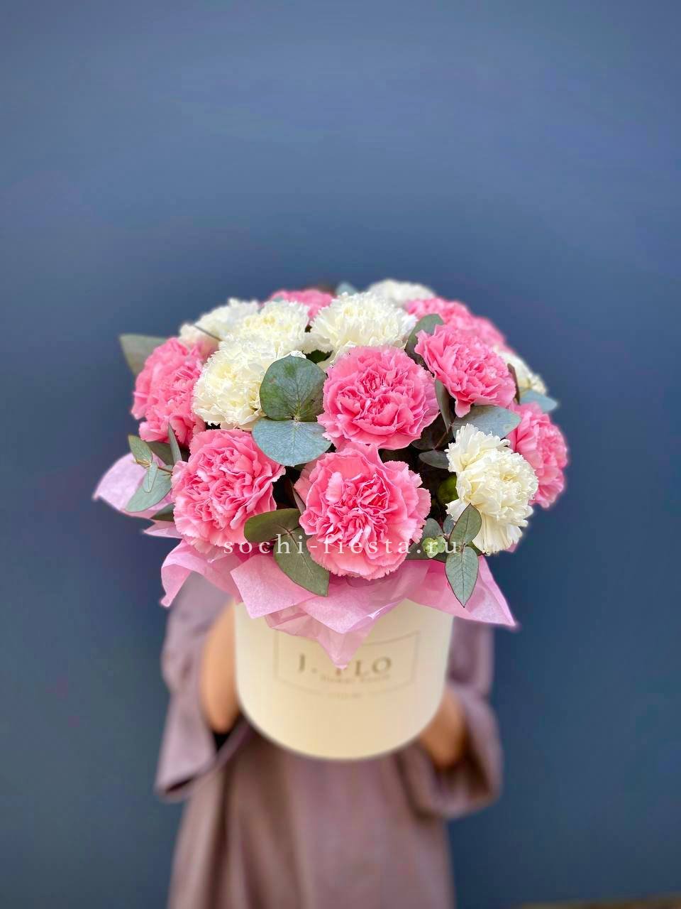 Эустомы и пионовидные розы соседствуют с французскими макарон в коробке в форме сердца. Диантусы и эвкалипт создают объём, а сладкий акцент делает композицию завершённой.