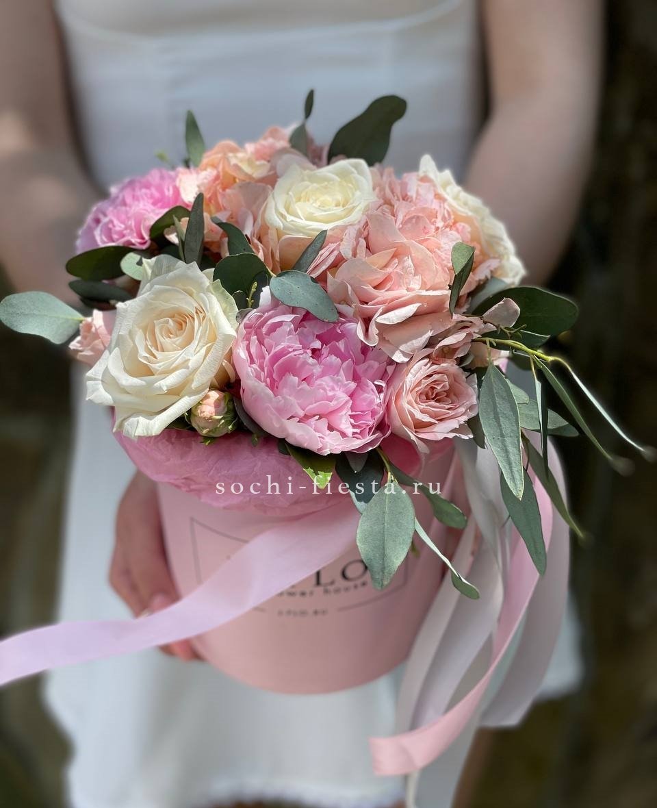 пион, розы одноголовые, гортензия, пионовидная роза, тишью, коробка D13 Цвет коробки может быть согласован с заказчиком.