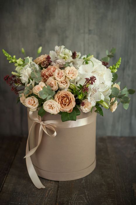 пион, розы одноголовые, гортензия, пионовидная роза, эвкалипт, тишью, коробка D13 Цвет коробки может быть согласован с заказчиком.
