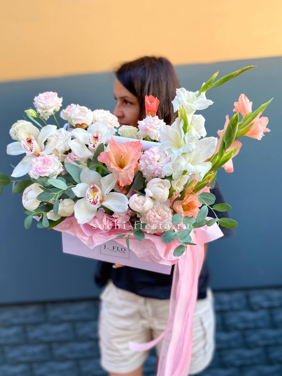 Орхидея задаёт вертикальный ритм всей композиции в ящике. Пионы и эустома заполняют пространство плотными бутонами кремовых оттенков. Сочная зелень подчёркивает архитектуру всей формы.