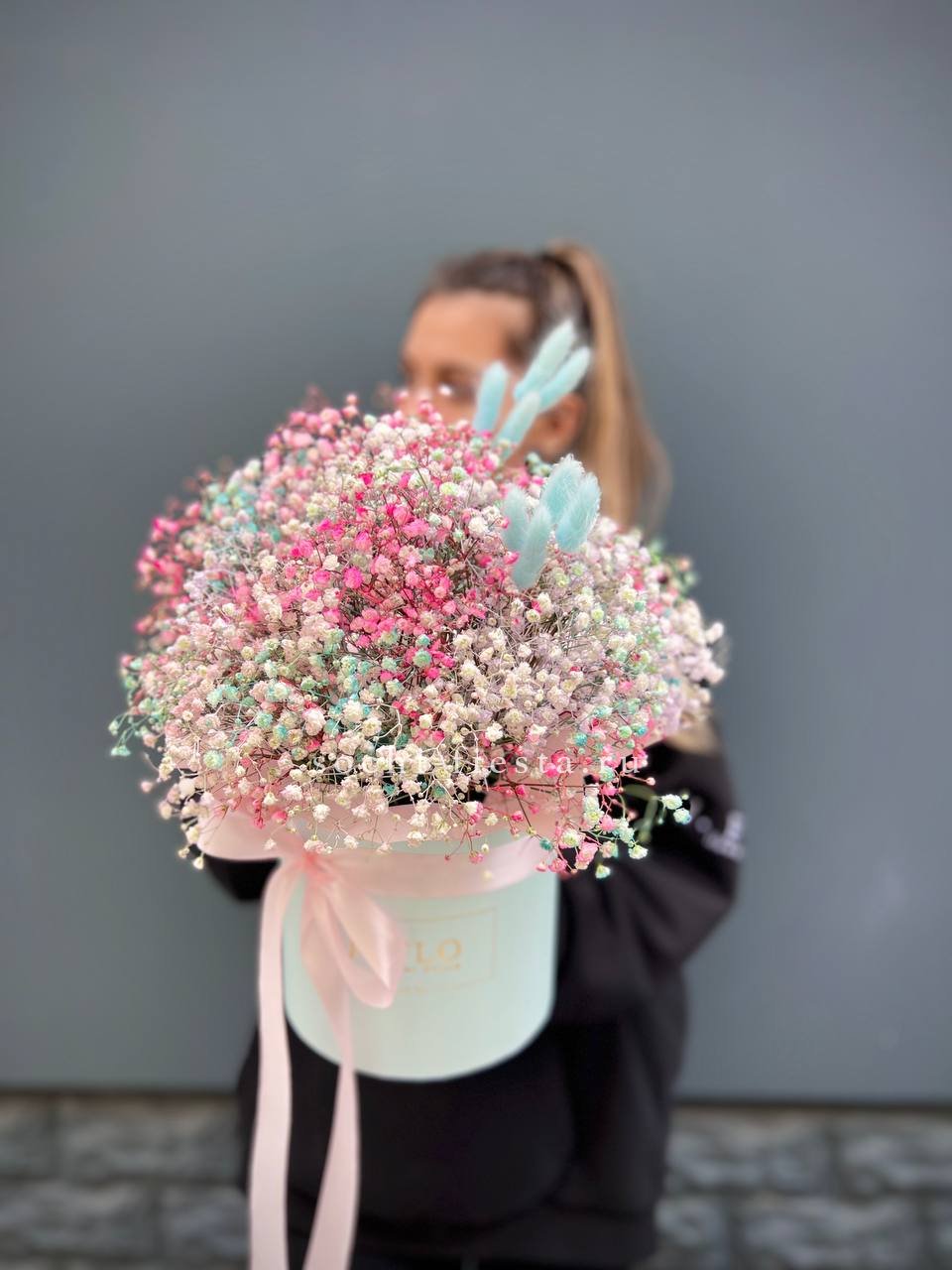Воздушные ветки гипсофилы окрашены в радужные оттенки и дополнены пушистым лагурусом. Композиция собрана в компактный цилиндр и создаёт яркое цветовое пятно в любом интерьере.
