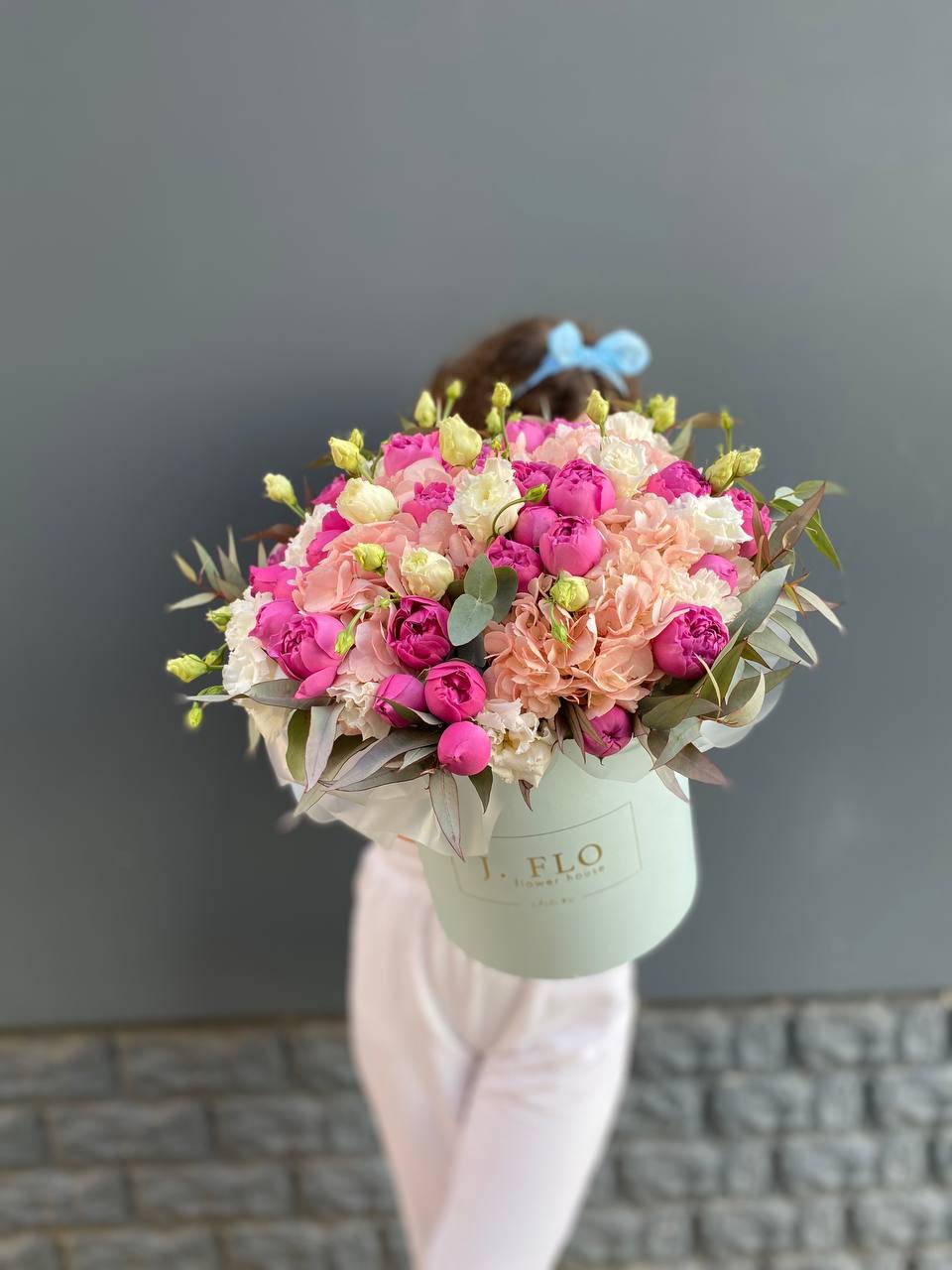 пионовидная роза, гортензия, эустома, декоративная зелень, бокс D20.