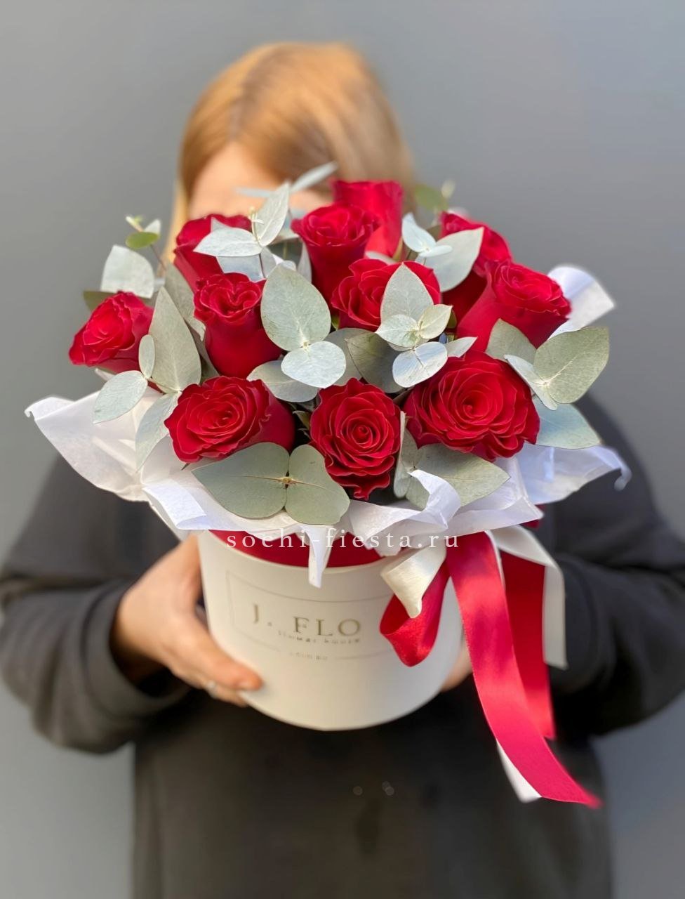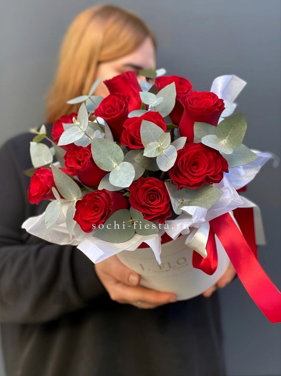 Пионовидная роза Бомбастик образует плотные бутоны с множеством лепестков. Эвкалипт добавляет свежести и завершает форму. Компактная коробка удобна для передачи из рук в руки.