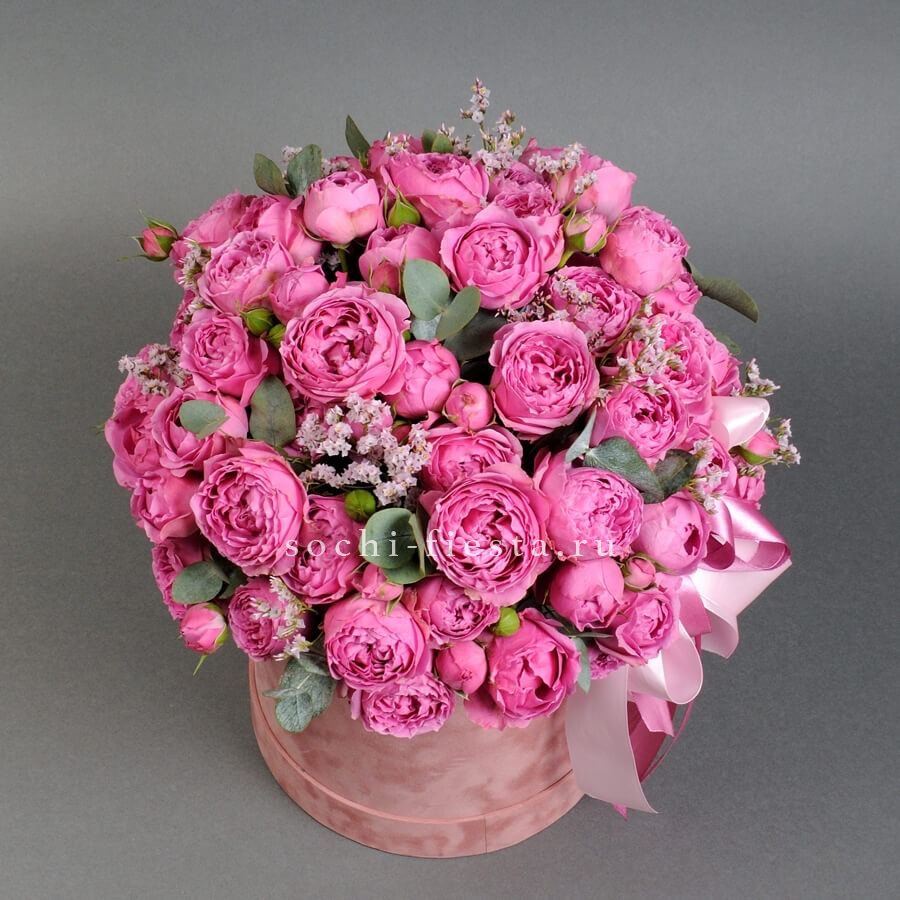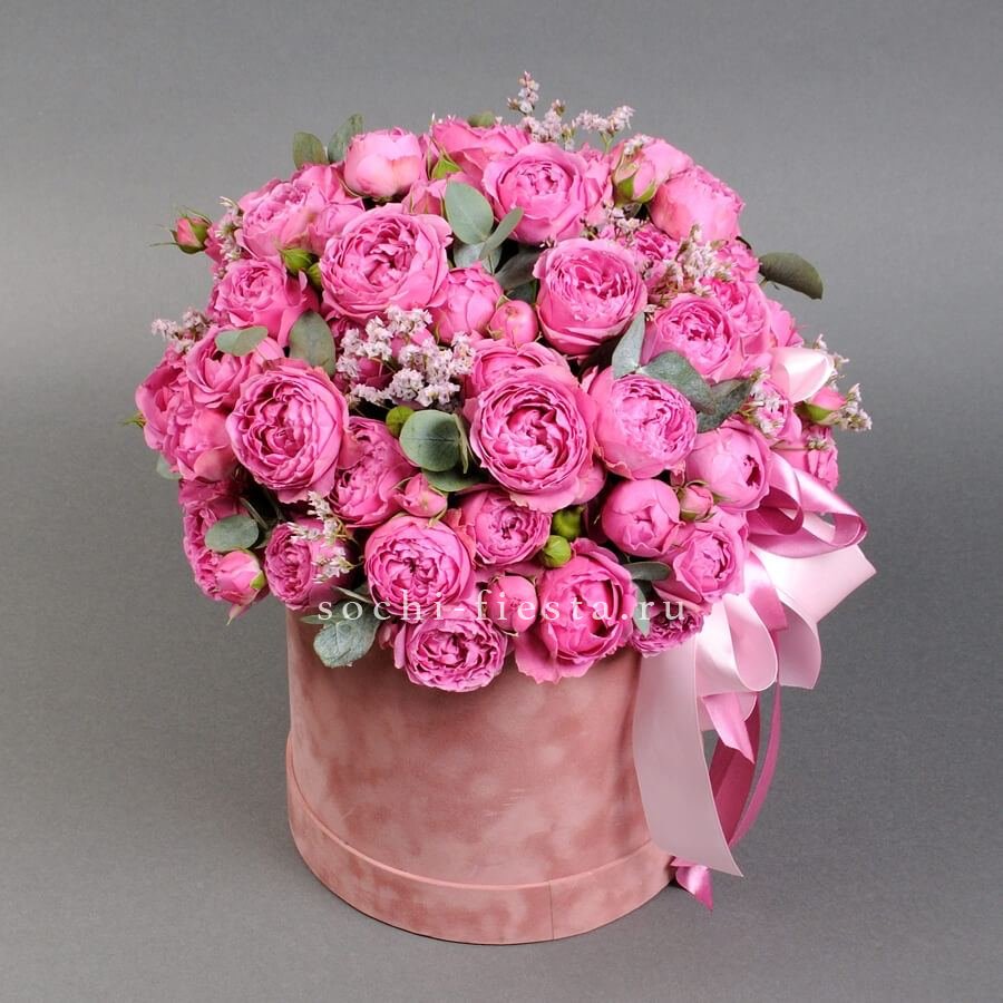 пионовидная кустовая роза бомбастик - 31 веточек, эвкалипт, лента, цилиндр D20.