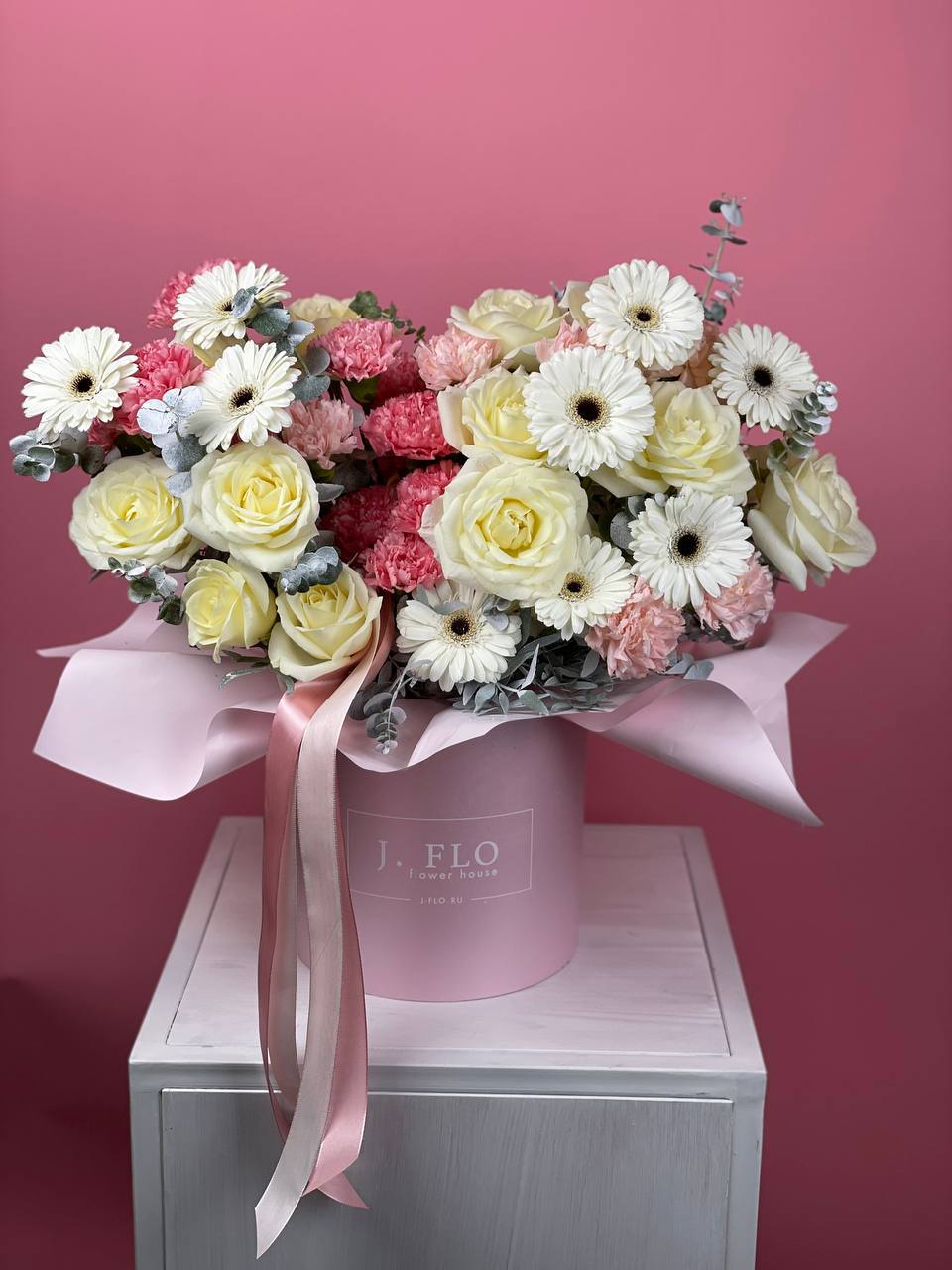 Три оттенка в одной композиции: чистота белых роз, яркость гербер и воздушность диантусов. Эвкалипт создаёт мягкий фон для каждого цветка.
