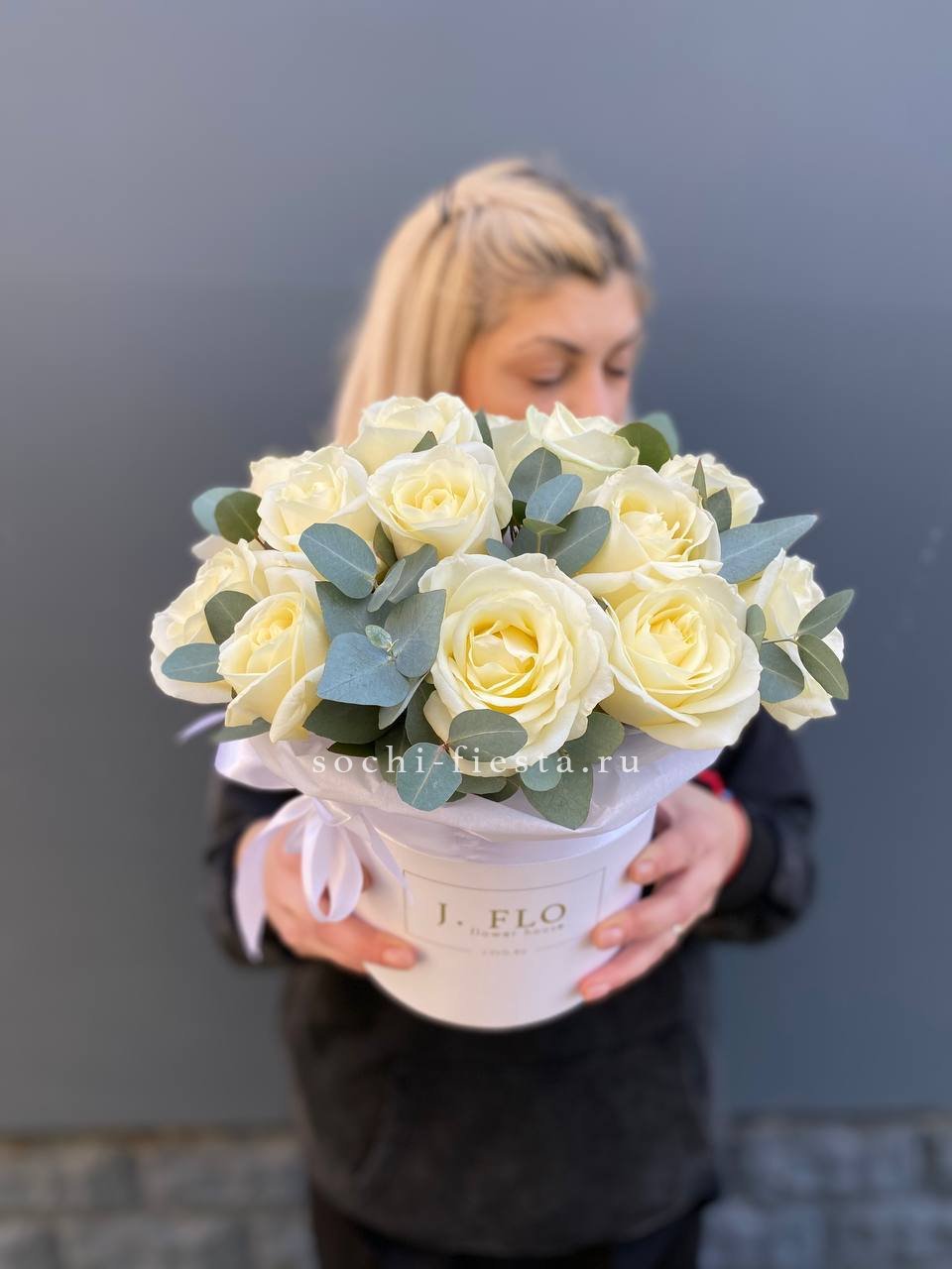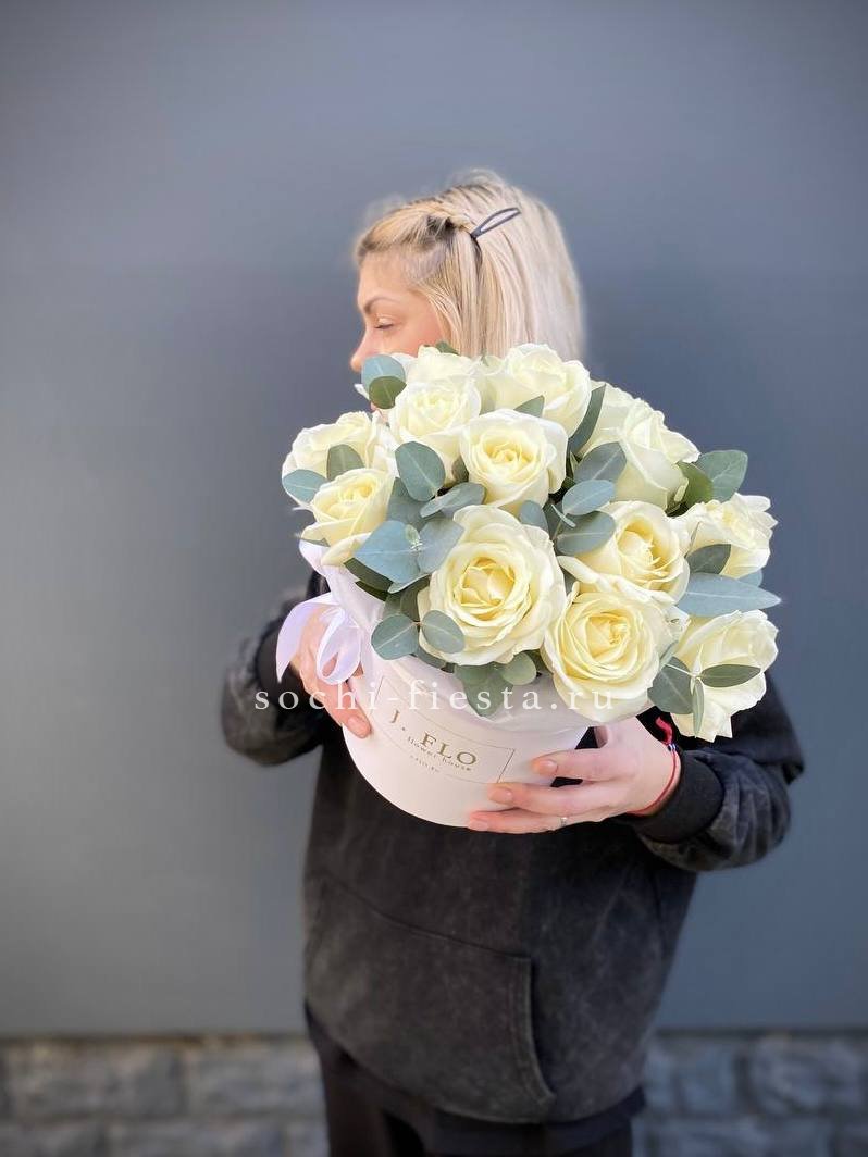 белые розы, диантусы, герберы, эвкалипт, бокс 20.
