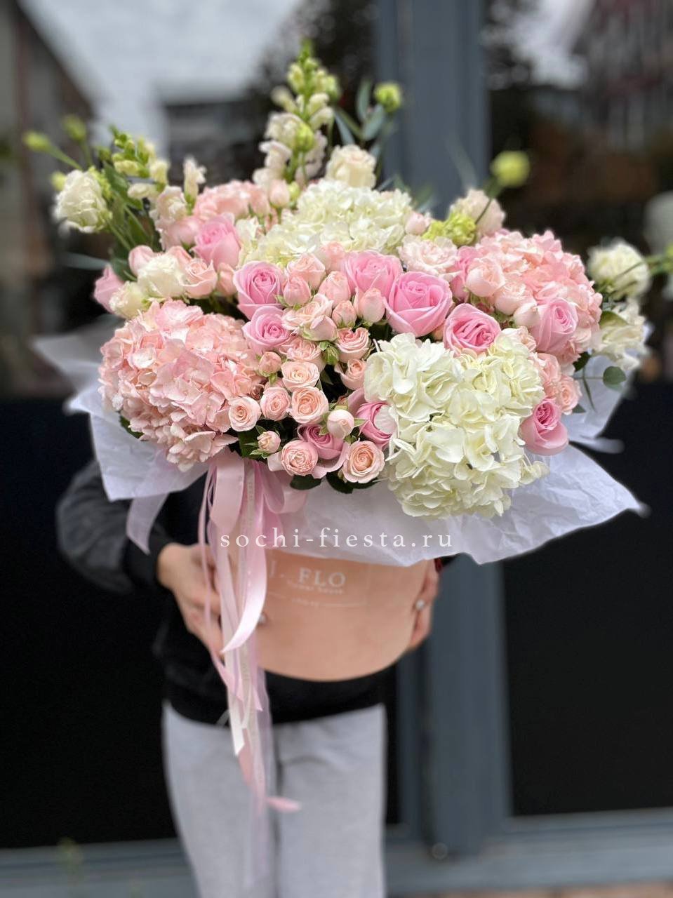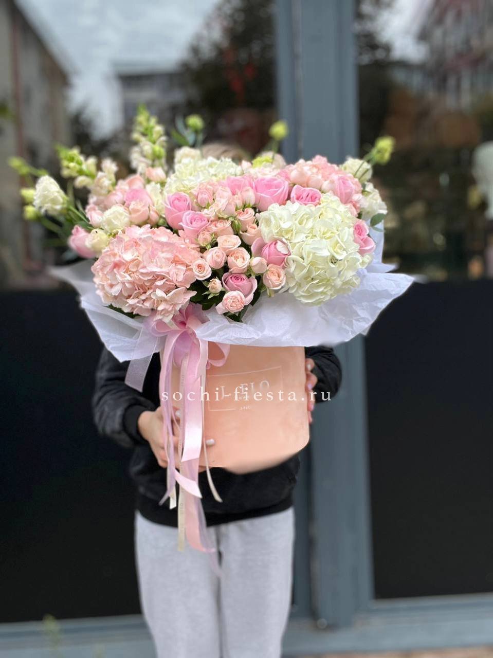 пионовидные кустовые розы, эвкалипт, лимониум, зелень, лента, цилиндр D16.