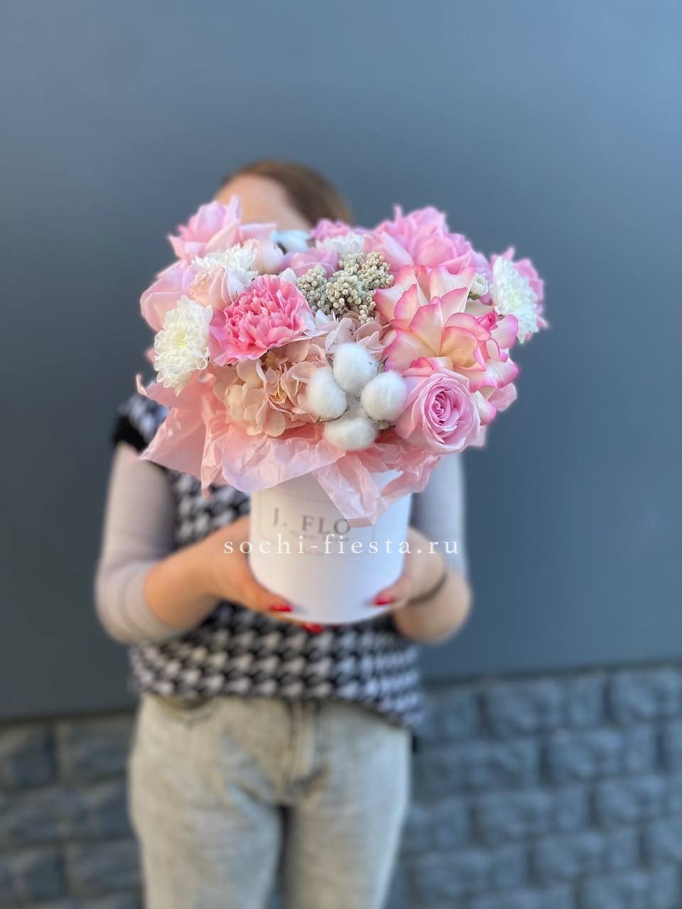 Пионовидные кустовые розы формируют плотный купол с мягкими переходами оттенков. Каждый бутон раскрывается слоями, создавая объёмную текстуру. Эвкалипт добавляет свежести композиции в цилиндре.