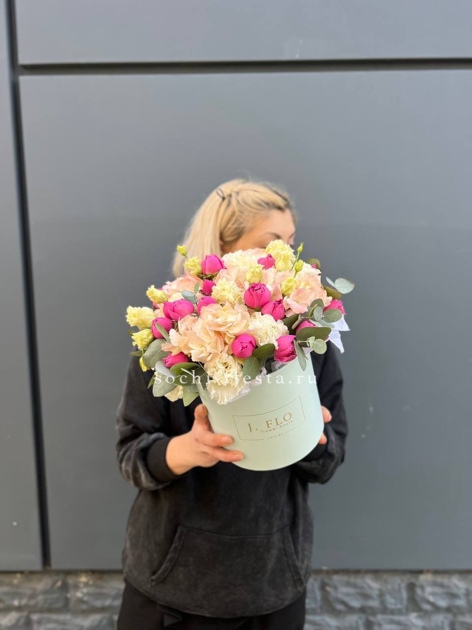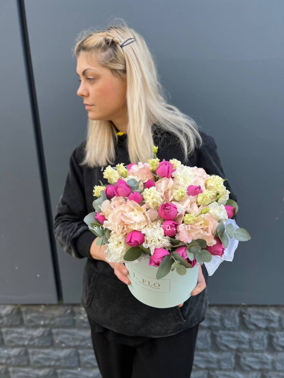 гортензия, пионовидные розы, эустома, эвкалипт, бокс 16.