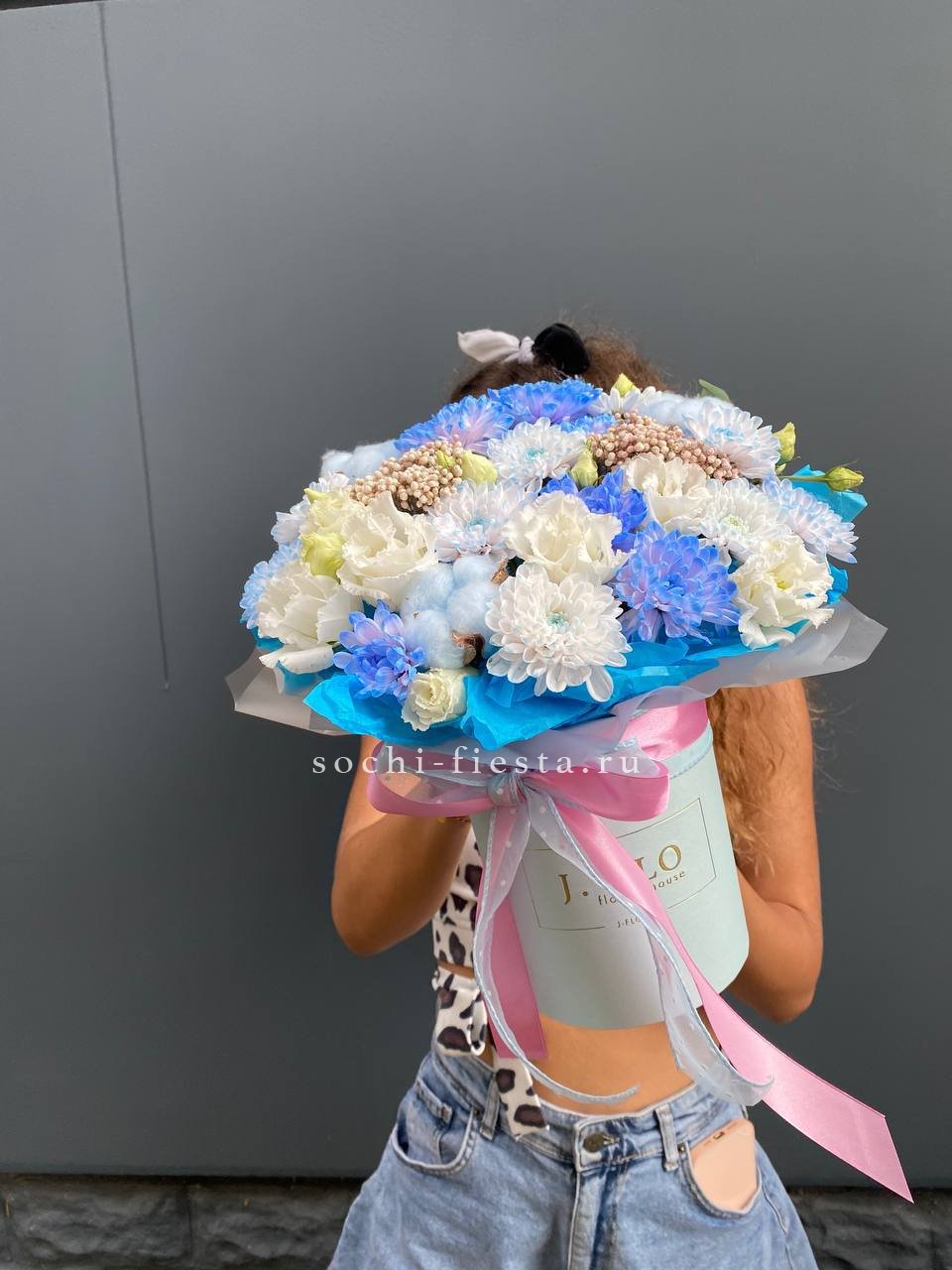 Кустовые хризантемы и эустома с хлопком формируют лёгкую воздушную массу. Озотамус поддерживает природную фактуру. Композиция долго сохраняет свежий вид и не требует сложного ухода.
