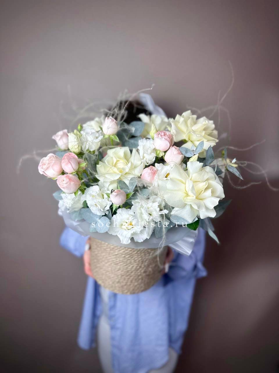 роза французская, эвкалипт, лист Чико (аналог), джутовое кашпо, оазис.
