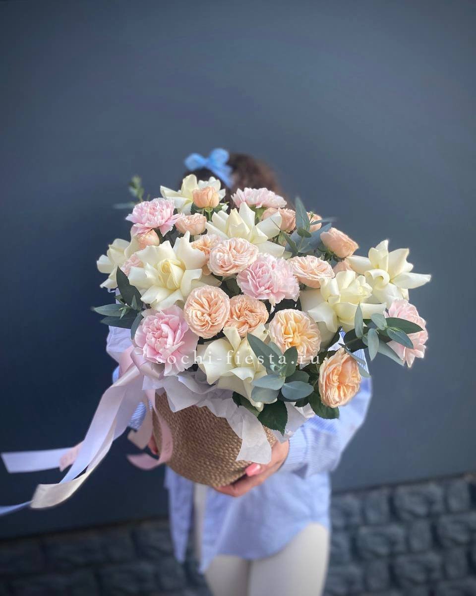 Мягкая палитра белых оттенков с вкраплениями диантуса создает воздушную композицию в натуральном джутовом кашпо. Кустовые розы добавляют объем, а эвкалипт завершает природную гармонию. Готовое решение для интерьера в спокойных тонах.