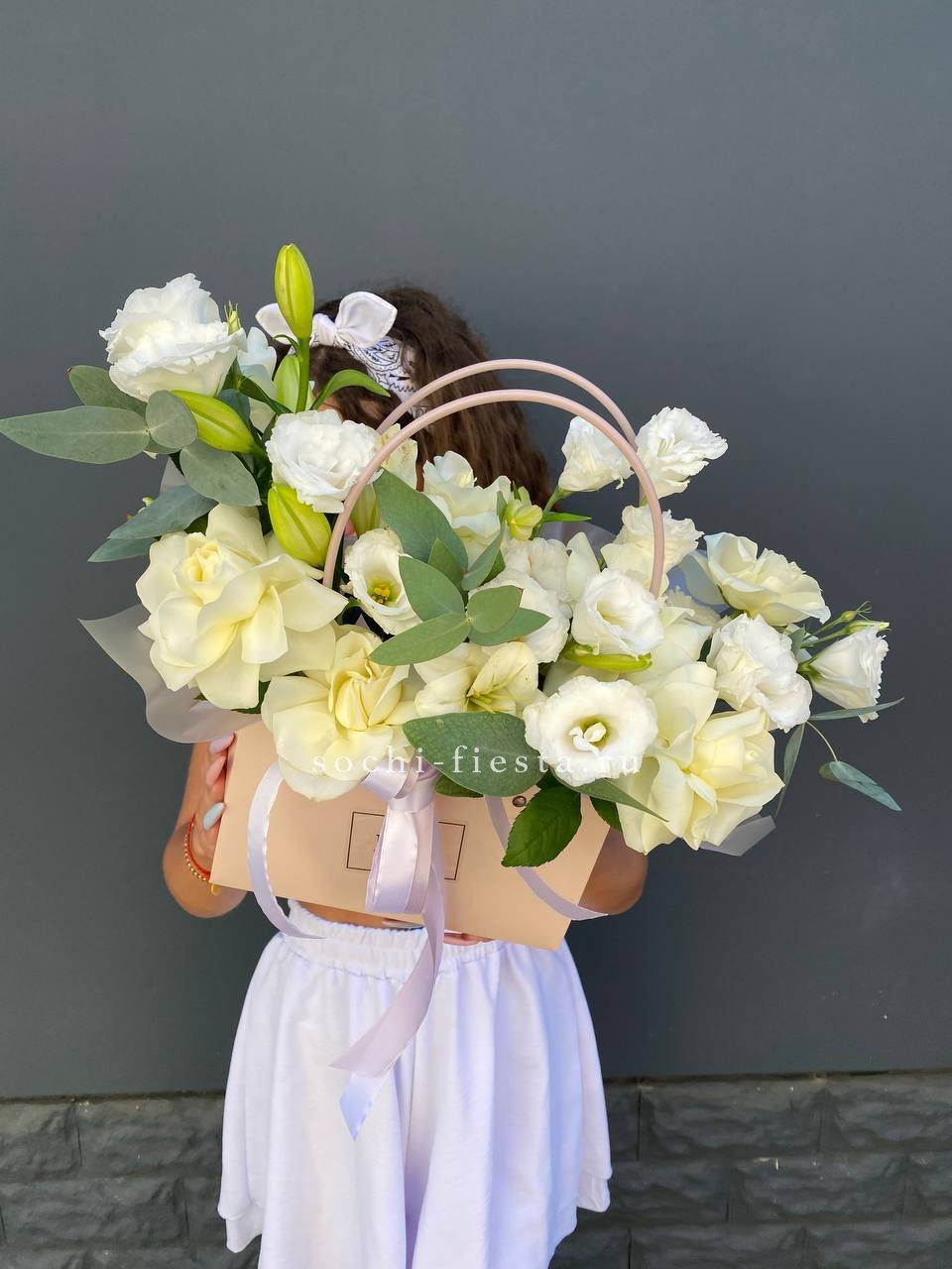Хризантемы с пушистыми коробочками хлопка создают теплую домашнюю композицию в удобной сумочке. Цветы долго радуют взгляд и не требуют сложного ухода. Формат подходит для размещения в любом уголке дома.
