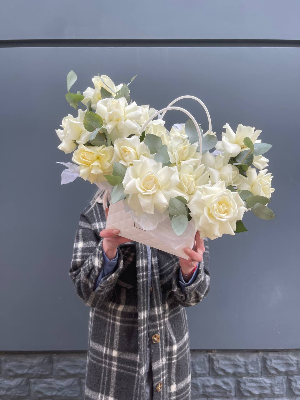 Розовые розы и диантусы переплетаются с кустовыми хризантемами в плотной округлой композиции. Альстромерия добавляет графичные акценты между бутонами. Сумочка собирает все элементы в аккуратную форму с естественным объёмом.