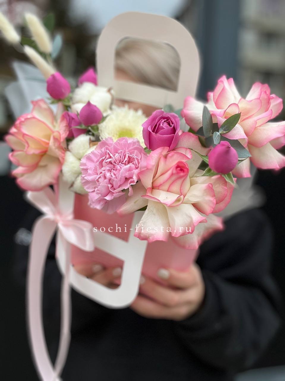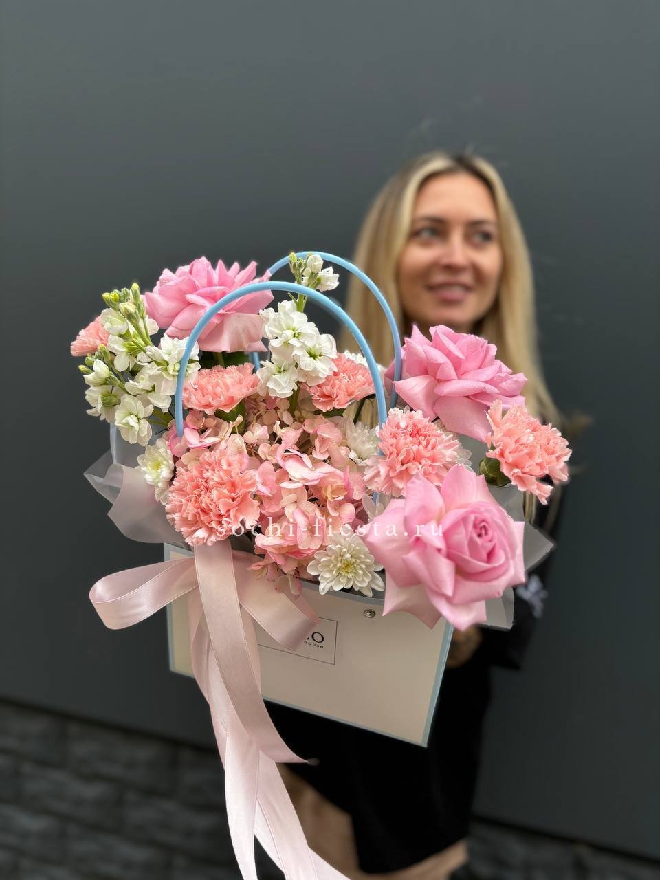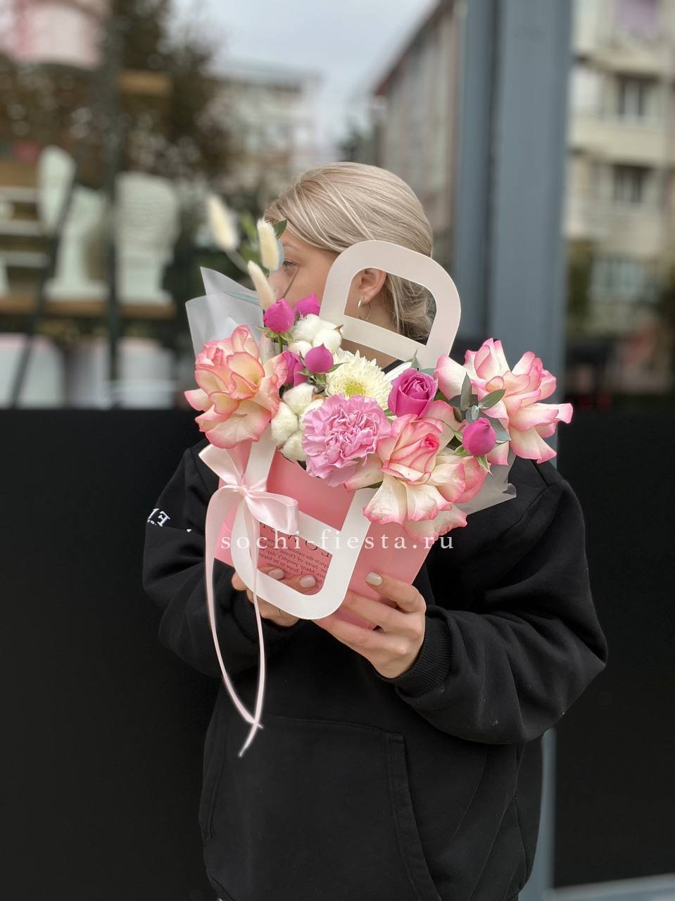 Французские розы собраны в аккуратную форму и помещены в сумочку. Компактная композиция легко помещается на столе или полке, сохраняя свежесть и опрятный вид.