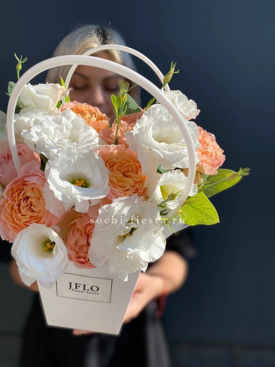 Пионовидные розы раскрываются пышными шапками рядом с воздушными соцветиями эустомы. Компактная форма сумочки удобна для вручения и не требует поиска вазы.