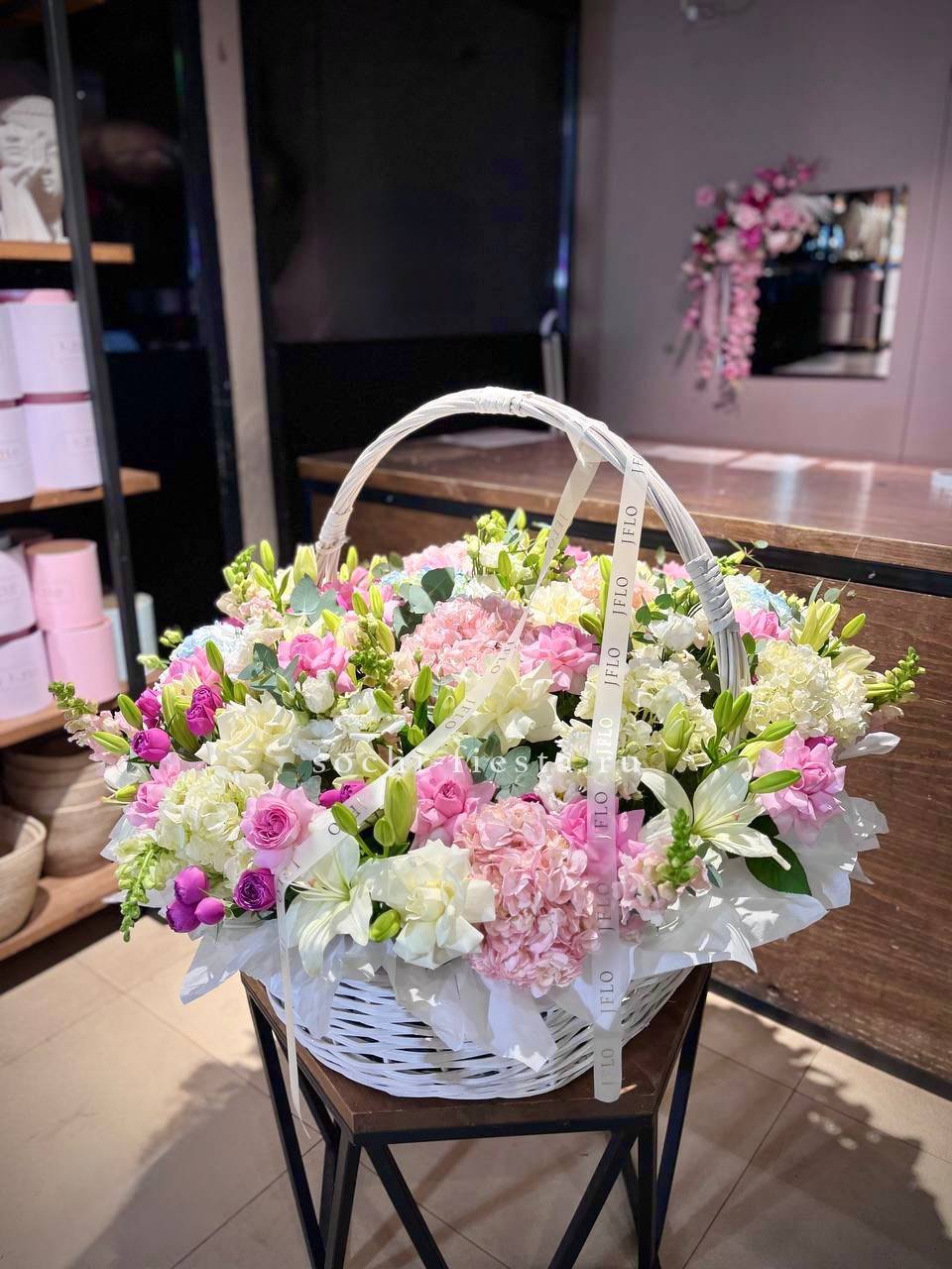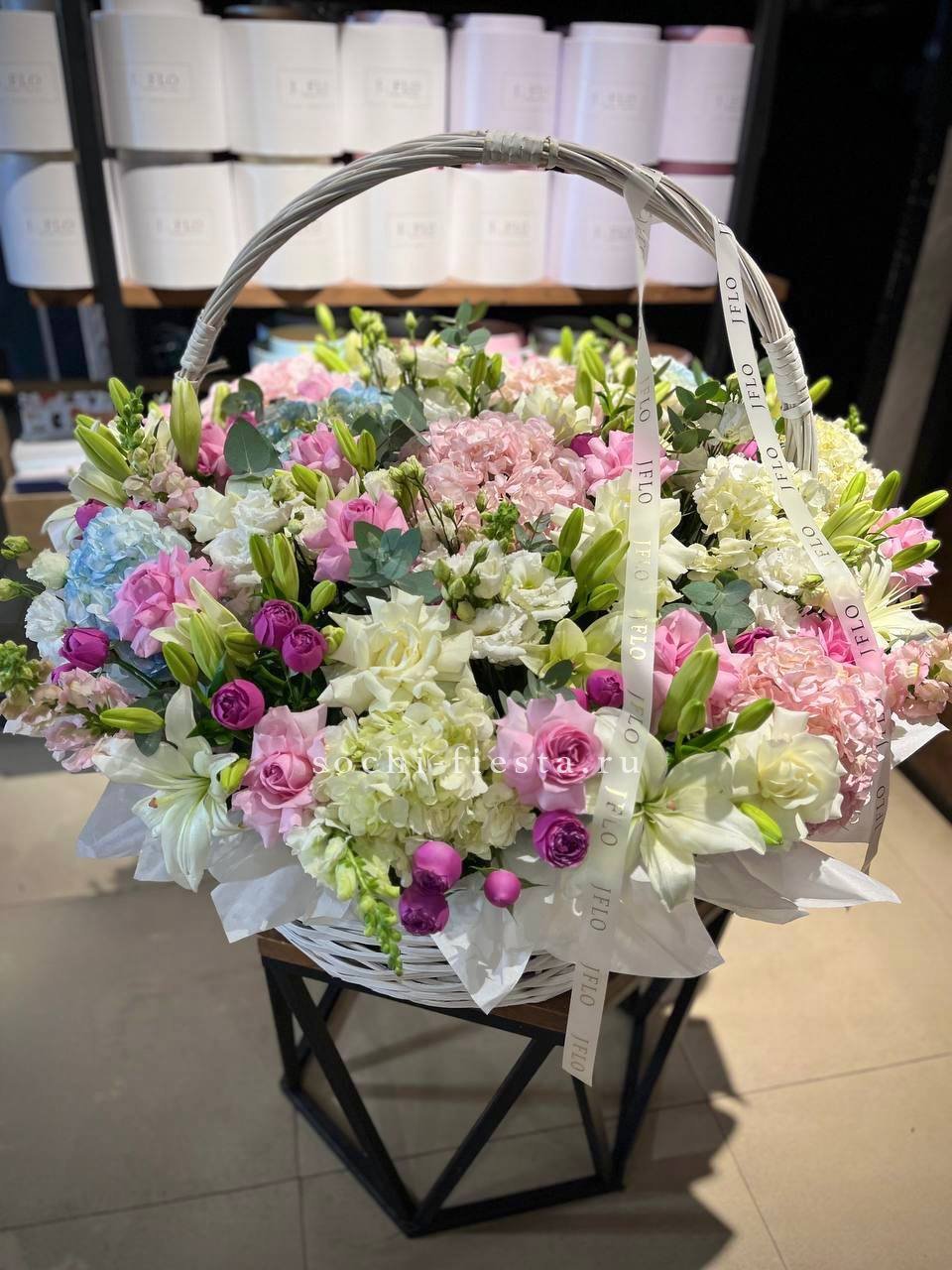 гортензия, диантус, розовая роза, эустома, гербера, корзина средняя, наполнение.