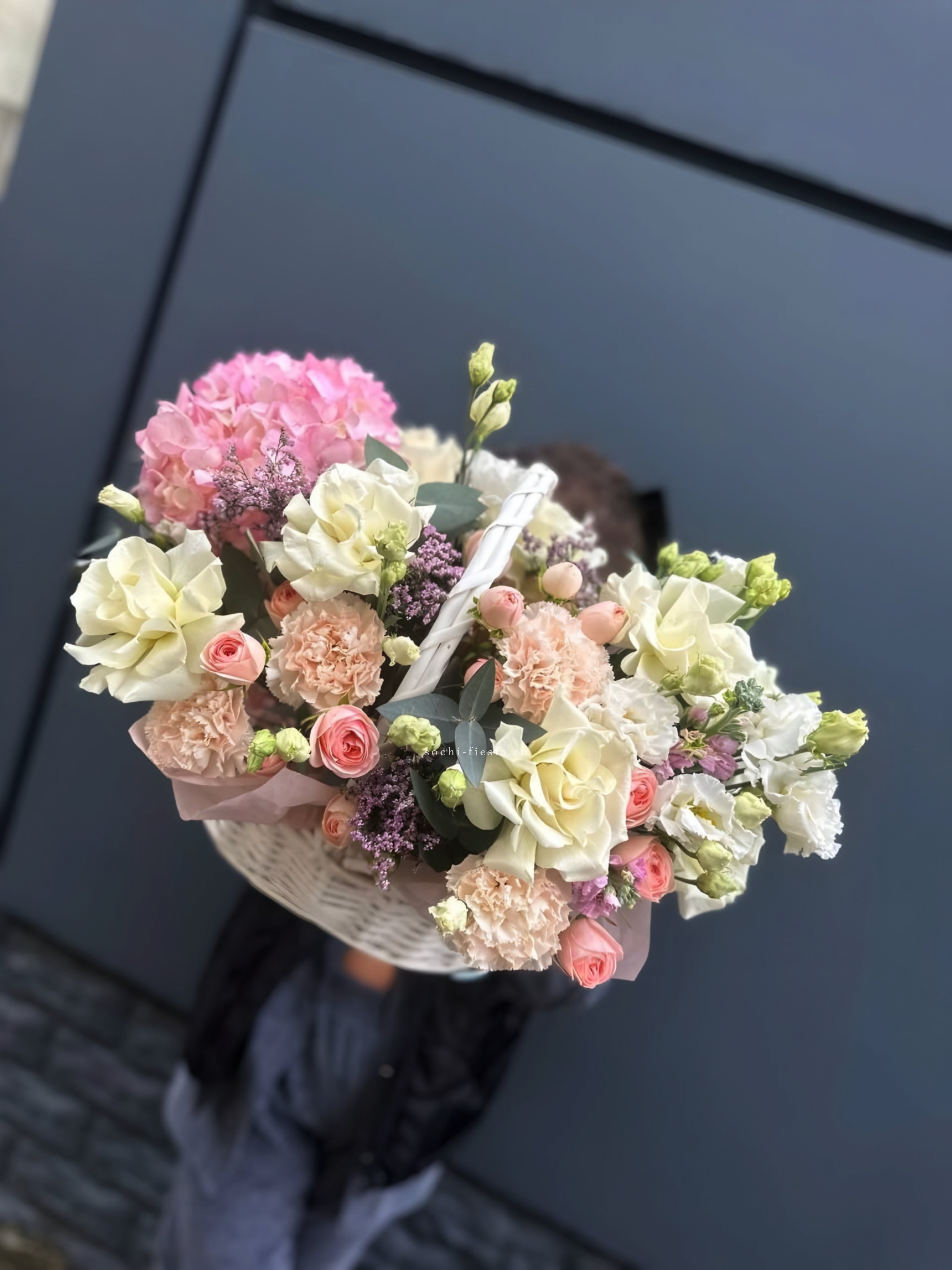лилии, гортензия, антиринум, мисти баблс, розы, эустома, корзина гигант.