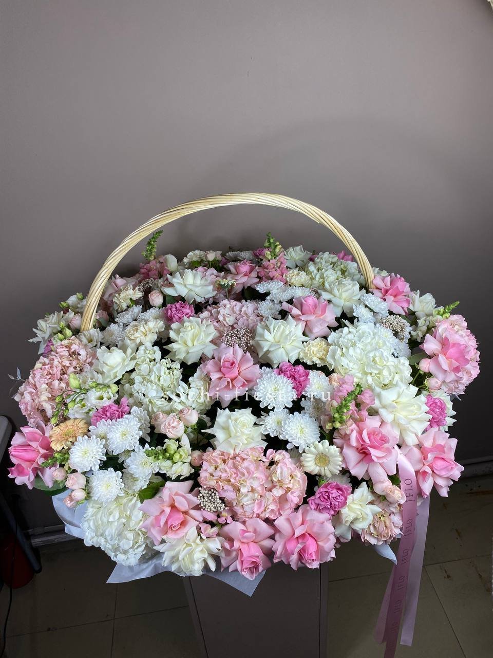 Плотная россыпь кустовых роз и эустомы создает живую текстуру с множеством мелких бутонов. Диантус добавляет воздушности, а эвкалипт собирает композицию в завершенную форму. Корзина позволяет разместить букет на столе без дополнительной вазы.